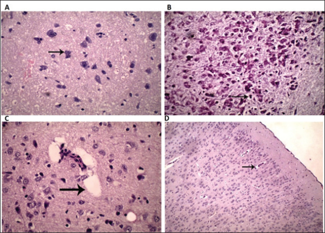 Fig. 4. Histopathological changes of brain of dams and rats pups received silver nanoparticles during gestation or after delivery. (A): Section from brain of parturient dam received 100 mg/kg BW AgNPs from 6th until 15th day of pregnancy, showing neuronal necrosis and satellitosis (arrow). (HE, 400x). (B): Section from brain of fetus from dam received 100 mg/kg BW AgNPs from 7th until 15th day of pregnancy, showing proliferation of glial cells (arrow). (HE, 400x). (C): Section from brain of suckling pups (21-day old age) from dam received 50 mg/kg AgNPs from delivery until weaning, showing perivascular edema (arrow). (HE, 400x). (D): Section from brain of suckling pups (21 day old age) from dam received 100 mg/kg BW AgNPs from delivery till weaning, showing perivascular edema (arrow) (HE,100x). The outcomes of the current study align with prior research, demonstrating that oral exposure to AgNPs led to an increase in silver concentration in the brains of adult rats. However, the amount observed was still notably lower than the silver concentration found in the brains of pups treated with AgNPs. This was because the small size of the AgNPs made them more likely than their ion form to cross biological barriers. The study also found that the AgNPs caused perivascular cuffing of lymphocytes, neuronal necrosis, and satellitosis in the brains of feti. Due to the blood–brain barrier’s (BBB) lack of functionality, it was able to cross the placental barrier, distribute to the fetus brain, and accumulate in other organs of the pups (Jiang et al., 2008; Abbott et al., 2010; Park et al., 2011; Philbrook et al., 2011; Lee et al., 2012; Melnik et al., 2013). Histological abnormalities in the cerebellum and brain tissue were induced by AgNPs. The BBB was not the sole pathway through which NPs could traverse; they could also compromise the integrity of the barrier. Moreover, NPs could instigate apoptosis by generating ROS that act as signaling molecules. Finally, NPs demonstrated the ability to alter the function of glutamate, the primary excitatory neurotransmitter in the brain, by enhancing the quantity of N-methyl-D-aspartate receptor receptors. This led to the degeneration of glutamatergic neurons and impaired cellular excitation, as identified in the study by Cortese-Krott et al. (2009). The toxicity observed was attributed to these effects of AgNPs. Contrarily, the oral administration of AgNPs to pregnant female rats, as detailed in the study by Rashno et al. (2014), did not induce any adverse effects on the pregnant dams or the fetal growth. The only observed impact was a temporary delay in the development of neurobehavioral reflexes in the offspring during the early postpartum period, with no reported issues later in the infants’ lives. Moreover, the present study corroborates a prior investigation that identified brain edema and the disruption of the blood-brain barrier resulting from nanoparticle exposure. The alterations in the brain were noted in regions where there was evidence of leakage of the blood-brain barrier protein tracer. AgNPs affect various components of the brain, encompassing both neuronal and non-neuronal regions, such as nerve, glial, and endothelial cells, as well as axons. The impact of NPs on endothelial cells resulted in perivascular edema, sponginess, and an increase in neutrophils approximately small blood vessels. AgNPs demonstrated a more pronounced influence on the physiological function of the brain (Sharma et al., 2010; Moradi-Sardareh et al., 2018). ConclusionOral administration of AgNPs to pregnant or lactating rats at a dose of 50 or 100 mg/kg induced toxic and teratogenic effects in terms of delayed ossification, abnormal limb formation, brain edema in rat pups, however induced necrosis and satellitosis in adult female rats. Hence, greater emphasis should be placed on preventing exposure to Ag-NPs, especially among pregnant females when used medical stuffs or cosmetics contain Ag-NPs. AcknowledgmentThis work was supported by the Deanship of Scientific Research, Vice Presidency for Graduate Studies and Scientific Research, King Faisal University, Saudi Arabia (Project No. GRANT- A142). Conflict of interestAll authors had no conflict of interest regarding any aspect of this publication. FundingDeanship of Scientific Research, Vice Presidency for Graduate Studies and Scientific Research, King Faisal University, Saudi Arabia (Project No. GRANT- A142). Authors’ contributionsAll authors contributed to the present study. Data AvailabilityData will be available upon reasonable request. ReferencesAbbott, N.J., Patabendige, A.A., Dolman, D.E., Yusof, S.R. and Begley, D.J. 2010. Structure and function of the blood–brain barrier. Neurobiol. Dis. 37(1), 13–25. Alarcon, E.I., Griffith, M. and Udekwu, K.I. 2015. Silver nanoparticle applications. Springer International Publishing, Switzerland, 10, 973-978. Behbudi, G.2021. Effect of silver nanoparticles disinfectant on covid-19. Adv. Nano. Res. 2(2), 63–67. Ciriminna, R., Albo, Y. and Pagliaro, M. 2020. New antivirals and antibacterials based on silver nanoparticles. Chem. Med. Chem. 15(17), 1619–1623. Cortese-Krott, M.M., Münchow, M., Pirev, E., Hessner, F., Bozkurt, A., Uciechowski, P., Pallua, N., Kröncke, K.D. and Suschek. C.V. 2009. Silver ions induce oxidative stress and intracellular zinc release in human skin fibroblasts. Free Radic. Biol. Med. 47, 1570–7. Deshmukh, S.P., Patil, S., Mullani, S. and Delekar, S. 2019. Silver nanoparticles as an effective disinfectant: a review. Mater. Sci. Eng. C 97, 954–965. Gad, S.C., and Weil, C. 1982. Principles and methods of toxicology. New York, NY: by Hayes AW, Raven Press, pp: 273–320. Ghaderi, S., Tabatabaei, S.R.F., Varzi, H.N. and Rashno, M. 2015. Induced adverse effects of prenatal exposure to silver nanoparticles on neurobehavioral development of offspring of mice. J. Toxicol. Sci. 40(2), 263–275. Ghosh, M., Manivannan, J., Sinha, S., Chakraborty, 
