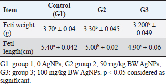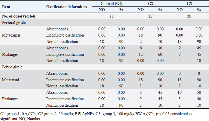 DiscussionAround the world, nanotechnology is a major concern in a lot of fields. AgNPs were used in medicine and veterinary care for a variety of purposes, including antibacterial, disinfectant, anticancer, and household. In this work, we investigated the effects of AgNPs on the mother, the embryo’s toxicity, and the postnatal development in female albino rats at doses of 1/100 and 1/50 of LD50 (or 50, 100 mg/kg) from the 7th to the 15th day of gestation for the prenatal study, and from the 1st to the 21st day after delivery for the postnatal study. This research supported the findings of (Mahabady, 2012) who discovered that exposure to 0.4 and 0.8 mg/kg of AgNPs in the eighth and ninth days of rat gestation decreased the weight and length of embryos and did not result in skeletal malformation. The current study also demonstrated that AgNPs decrease the body weight and crown rump of the feti from dams received them during the pregnancy period. According to Prakash et al. (2018) oral administration of AgNPs to a pregnant woman may have caused placental translocation of the particles into the fetus’s organs, which may have resulted in a reduction of the feti body weight and crown rump. According to the current study, skeletal abnormalities in the ribs, skull, metacarpal and metatarsal bones, and phalanges were caused by AgNPs. In this context, Prakash et al. (2018). Multiple skeletal malformations as a teratogenic anomaly that was seen in foetuses from dam rats that were given repeated oral doses of larger size AgNPs colloidal solution. The increasing percentages were examined in correlation with the increase in dose. The control group showed a minimal 9% malformation rate, while the treated group exhibited higher percentages of 63% and 79% with doses of 14 mg/kg/day and 19 mg/kg/day, respectively. Among these skeletal abnormalities were instances of oligodactyly, syndactyly, and limb malformations.