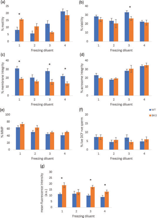 Table 3. Post-thaw evaluation of the characteristics of WT (n=24) and BKO (n=21) mouse spermatozoa subjected to different freezing media.