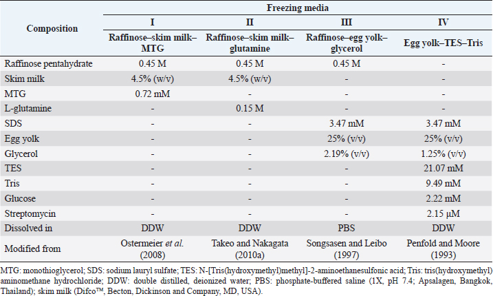 AbstractBackground: The mouse model of human diseases is commonly used for biomedical study, including β-thalassemia (β-thal), an inherited hemoglobin disorder. Maintaining the mice strain by natural mating systems is costly and seems impractical, especially during the COVID-19 pandemic. Sperm-freezing is a cost-effective solution for β-thal mouse colony management. Aim: To determine appropriate cryopreservation media for β-thal mouse spermatozoa to establish a β-thal mouse sperm bank. Methods: The epididymal spermatozoa of C57BL/6 wild-type (WT) and β-globin gene knockout thalassemia (BKO) mice were frozen in four freezing media: I) raffinose–skim milk–monothioglycerol (MTG), II) raffinose–skim milk–glutamine, III) raffinose–egg yolk–glycerol, and IV) egg yolk–TES–Tris. The sperm quality was assessed prior to and following freeze-thawing. Results: Compared with WT counterparts, the viable spermatozoa before freezing exhibiting elevated levels of oxidative stress were significantly greater in BKO (p=0.01). After thawing, the membrane integrity of BKO spermatozoa preserved in I was significantly lower (p=0.001). The sperm viability and membrane integrity of BKO males were also inferior when media III and IV were used (p=0.008–0.027). The amount of oxidative stress in the spermatozoon of BKO mice was significantly greater when preserved in I, III, and IV (p=0.002–0.044). Comparing freezing media, the motility and acrosome integrity of WT and BKO spermatozoa preserved in IV were significantly higher than those in other media (p < 0.001 to p=0.01). Spermatozoa with the highest mitochondrial membrane potential were observed in I in both genotypes (p=0.012 to p > 0.05). The viability, membrane integrity, and oxidative stress of post-thaw BKO spermatozoa did not significantly differ among freezing solutions. Conclusion: Irrespective of freezing media, spermatozoa of BKO males are rather more sensitive to cryopreservation than those of WT. Raffinose–skim milk–MTG/glutamine, raffinose–egg yolk–glycerol, and egg yolk–TES–Tris can all be used to preserve BKO mouse spermatozoa. However, with slightly better sperm characteristics, egg yolk–TES–Tris may be a diluent of choice for BKO mouse sperm cryopreservation. The addition of a reducing agent to thawing media is also strongly recommended to efficiently prevent oxidative stress and therefore improve frozen-thawed sperm survival. Keywords: Anemia, Freezing extender, Mouse, Sperm characteristics. IntroductionMice (Mus musculus) are closely similar to humans in, for example, biological characteristics, genetics, anatomy, and physiology; thus, they are the preferred laboratory animals used for biomedical research (Silver, 2001; Justice and Dhillon, 2016). However, just one mouse strain/stock cannot be a suitable proxy for all the areas studied. Therefore, many mice strains with the induced mutation have been generated worldwide (Bedell et al., 1997; Simpson et al., 1997). Maintaining these strains by natural mating systems controlled by animal facility staff is becoming a significant problem, especially in a COVID-19 outbreak era in which human mobility restriction has been implemented in most countries. Freezing of gametes (oocytes and spermatozoa) and embryos seems a viable solution. Among them, sperm-freezing seems the least complicated and least expensive operation to achieve this goal, since only one sperm donor can provide huge numbers of gametes to be preserved (Nakagata, 2000). Up to now, numerous reports have demonstrated moderately successful mouse sperm cryopreservation by using various procedures. The raffinose–skim milk-based diluent has been refined and applied to epididymal spermatozoa of different mouse strains as a cryopreservation solution (Nakagata and Takeshima, 1993; Nakagata et al., 1995; Nakagata, 1996). Using this diluent, monothioglycerol (MTG) or L-glutamine, an antioxidant, was also included in a certain amount to mitigate sperm cryoinjury and therefore improve sperm quality after cryopreservation. Ostermeier et al. (2008) found that the presence of MTG in the freezing medium increased the fertilizing capacity of frozen-thawed C57BL/6J spermatozoa. Similarly, the in vitro fertilization rates of frozen-thawed C57BL/6J spermatozoa were improved when L-glutamine was added to the raffinose–skim milk-based diluent (Takeo and Nakagata, 2010a). Furthermore, cryopreservation of mouse spermatozoa has been undertaken with other freezing media, such as egg yolk–TES–Tris and raffinose–egg yolk–glycerol-based diluents with promising results (Penfold and Moore, 1993; Songsasen and Leibo, 1997). It has been demonstrated that 25% of the epididymal spermatozoa collected from CBA males regained motility after freezing and thawing in a modified egg yolk–TES–Tris solution. In vitro fertilization with the frozen–thawed sperm population resulted in 50% of oocytes developing to the two-cell stage, and two-cell embryos could develop into normal life offspring after embryo transfer (Penfold and Moore, 1993). Mouse sperm cryopreservation using the raffinose–egg yolk–glycerol-based diluent resulted in varying levels of sperm survival, depending on the mouse strains. Songsasen and Leibo (1997) found that using this diluent, epididymal spermatozoa of the B6D2F1 strain had the highest survival, while those of the C57BL/6J strain were the most sensitive. Such findings imply a genetic basis for the sensitivity of mouse spermatozoa to freezing injury, and there is no one-size-fits-all freezing medium for all mouse strains’ sperm cryopreservation. Therefore, the investigation and development of reliable and effective methods for freezing spermatozoa remain indispensable, primarily in genetically modified mice that have not been examined before. β-thalassemia (β-thal) is an inherited disorder of hemoglobin commonly found in Thais and populations of Mediterranean, African, and South Asian ancest