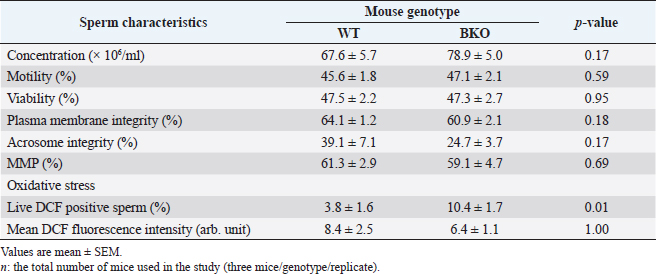 Sperm plasma membrane integrityThe integrity of the sperm plasma membrane in maintaining osmotic balance is one of the essential factors for successful fertilization (Ramu and Jeyendran, 2013). In the hypo-osmotic swelling test (HOST), sperm solution was mixed with 75 mOsm/kg hypo-osmotic solution, prepared with fructose and sodium citrate, at a ratio of 1:10 (v/v), respectively. The mixed solution was left for 20 minutes at 37°C and then aliquoted on a glass slide. The percentage of plasma membrane intact sperm developing tail swellings was given from 200 total spermatozoa per sample observed under a phase-contrast microscope (400×). Acrosome integrityThe acrosome reaction stage of epididymal spermatozoa was determined with a fluorescent dye specifically bound to the outer acrosomal membrane, i.e., fluorescein isothiocyanate-conjugated peanut agglutinin (FITC-PNA). In the staining process modified by Nagy et al. (2003), spermatozoa (2×106/ml, 120 µl) were incubated at 37°C for 10 minutes in phosphate-buffered saline (PBS) (1×, pH 7.4; Apsalagen, Bangkok, Thailand) containing 10 µl of FITC-PNA (25.7 µM). The membrane impermeant vital stain propidium iodide (PI; 74.8 µM) was added to counterstain damaged spermatozoa. The labeled sperm suspensions were added with 300 µl of PBS, remixed, and immediately analyzed. Cell fluorescence was excited in a flow cytometer using a 488-nm argon excitation laser. The red fluorescent signal of PI-positive cells is detected using fluorescence detector 3 (FL-3; 670 nm long-pass filter). FITC-PNA positive cells with a green fluorescent signal are detected using the fluorescence detector 1 (FL-1; 533/30 nm bandpass filters). Two-dimensional plots of forward- and side-scatter properties and FITC-PNA fluorescence versus PI fluorescence were drawn. Quadrants separated subpopulations, and the frequency of each subpopulation was quantified. Only subpopulation negative for PI and FITC-PNA (i.e., sperm cells with intact plasma membrane and acrosome) was reported. Mitochondrial membrane potential (MMP)Tetramethylrhodamine, ethyl ester (TMRE), a cell-permeant, a red-orange fluorescent dye readily sequestered by active mitochondria, is used to measure MMP in various cell types, including spermatozoa (Germain et al., 2021). The sperm MMP was measured with the TMRE solution (25 µM) which was made immediately before use from 2.5 mM stock solution dissolved in dimethyl sulfoxide. Two hundred microliters of samples (2 × 106 sperm/ml) were incubated at 37°C for 30 minutes in 800 µl of PBS with 10 µl of the dye. After that, the spermatozoa were washed by centrifugation (500×g, 5 minutes). The precipitant was resuspended in 500 µl of PBS before flow cytometric analysis. Like FITC-PNA/PI, the fluorochrome TMRE was excited with the 488-nm argon laser. Signals from the TMRE fluorescence were collected through the FL-2 detector (585/40 nm bandpass filter). Control samples with low MMP were performed simultaneously using 20 µM carbonyl cyanide m-chlorophenyl hydrazone, an inducer of mitochondrial damage. A proportion of spermatozoa with high MMP was recorded in each sample. Sperm oxidative stressThe present study used 2,7-dichlorofluorescein diacetate (H2DCFDA) to determine oxidative stress in epididymal spermatozoa. H2DCFDA is a non-fluorescent cell-permeant probe oxidized by intracellular ROS, predominantly H2O2, to form a 2,7-dichlorofluorescein (DCF) that emits green fluorescence at 530 nm in response to 488 nm excitation (Mupfiga et al., 2013). Briefly, 200 µl of the sperm suspension (2 × 106 sperm/ml) was diluted with PBS (800 µl) and added with H2DCFDA (20.5 µM, 20 µl). The mixture was incubated at 37°C for 15 minutes in the dark. Then, the excess unbound dye was removed by centrifugation (500×g, 5 minutes). The DCF-labeled spermatozoa at the bottom of the tubes were resuspended in PBS (1 ml) and added with PI (74.8 µM, 70 µl) to exclude the dead sperm population during flow cytometry analysis. The FL1 (DCF+ cells) and FL3 (PI+ cells) signals were detected through a 533/30 nm bandpass filter and 670 nm long-pass filter. Intracellular ROS levels were determined through mean DCF fluorescence intensity, with a higher fluorescence intensity considered an indicator of higher intracellular ROS. The present study analyzed the percentage of viable spermatozoa with high fluorescence intensity (DCF+ and PI− cells) and the fluorescence intensity per DCF+ and PI− cell. Additionally, as a positive control, freshly prepared H2O2 (10%, v/v) was added to an aliquot of each sample to induce intracellular ROS of spermatozoa. Statistical analysisThe fresh and frozen-thawed epididymal sperm quality of WT and BKO mice was given as mean ± standard error of the mean (SEM). Statistical analyses were performed using SPSS software (IBM SPSS Statistics 26.0). Data were tested for normality using the Shapiro–Wilk test. The Student's t-test and one-way analysis of variances, followed by Tukey’s Multiple Comparison test to figure out which groups differ were used to analyze normally distributed continuous data. Data with non-normal distributions were analyzed using nonparametric statistics, i.e., the Mann–Whitney U test and Kruskal–Wallis test accompanied by the Dunn–Bonferroni post-hoc method. Values of p < 0.05 were considered statistically significant. Ethical approvalAll mice procedures were undertaken following regulations concerning the use and care of experimental animals and were approved by the Animal Care and Use Committee at MB (COA.NO.IMB-ACUC 2021/014). ResultsFresh sperm characteristicsThe characteristics of spermatozoa collected from WT and BKO mice are demonstrated in Table 2. There were no significant differences (p > 0.05) in sperm parameters examined between both genotypes except the percentage of viable spermatozoa exhibiting elevated levels of oxidative stress, in which the value in BKO (10.4% ± 1.7%) was significantly greater than that in 