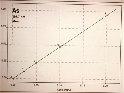 Fig. 2. Pb calibration curve. Ethical approvalThe authors adhered to all relevant international, national, and institutional guidelines for the care and use of animals. ResultsThe values obtained from the present study for selected heavy metals in liver of C. carpio are given in Table 1 and Figure 4. The results of the current study showed that all liver samples of C. carpio in 100% had a concentration of As and Pb less than the permissible limit of the WHO. The permissible limits for As and Pb set by WHO (1990) are (0.5 ppm) and (1.5 ppm), respectively. While Hg concentration in four liver samples (L1, L2, L3, L4) in 40% was within the permissible limit of WHO and in six liver samples in 60% was higher than the permissible limit of WHO (1990). The permissible limit for Hg set by WHO (1990) is (0.14 ppm).