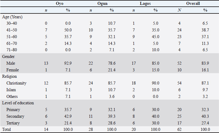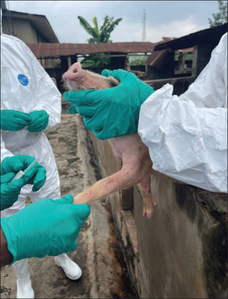 Fig. 2. Clinical evaluation and collection of blood samples from pigs by venipuncture during the ASF outbreak in Oyo state. Diagnosis of ASFOn each farm, we collected outbreak history data, including the timing of morbidity and mortality across various age groups, through interviews with farmers and farm records. Pigs were categorized into four age groups using farm records: piglets (pre-weaning), weaners (post-weaning to 12 weeks), growers (12 to 52 weeks), and adults (over 12 months). Clinical evaluations of affected pigs included assessments of rectal temperature, appetite, behavior, gait, and orifices. The skin was examined for lesions such as discoloration and hemorrhage. Group-housed pigs were further observed for huddling, shivering, respiratory distress, and other clinical indicators. Representative blood samples were collected via venipuncture for confirmatory diagnosis, and spleen tissue were obtained at postmortem. Labeled samples were submitted to the Molecular Virology Unit, Department of Virology, College of Medicine, University of Ibadan for the detection of ASFV using a p72 gene-targeted PCR assay (Onoja et al., 2022). Statistical analysisDescriptive statistics were used to analyze data to summarize outbreak patterns. The association between age categories and morbidity onset was assessed using the chi-square (χ²) test, with statistical significance set at p < 0.05. Ethical approvalInstitutional ethical approval for this study was obtained from the Animal Care and Use Research Ethics Committee of the University of Ibadan (Approval No. UI-ACUREC/099-0624/27). Informed consent was obtained from all participating farmers before the start of field investigations. ResultsDemographics and previous experience with ASFMost farmers (75.8%) were aged between 40 and 60 years, with a predominantly male representation (83.9%), and 87.1% identified as Christians (Table 1). Most respondents (87.1%) had over 5 years of experience in pig farming, and a substantial proportion (90.3%) reported pre-outbreak herd sizes of 200 pigs or less. All pig houses were open-sided. Notably, 72.6% of farmers had previously encountered ASF outbreaks, which were frequently associated with significant pig losses (Table 2). Table 1. Demographic characteristics of farmers affected by the ASF outbreak.