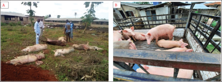 Fig. 3. A: Mass mortality of pigs and their disposal by burial during the outbreak of ASF in Ogun state. B: Panic sales and transportation of apparently healthy pigs in Ogun state. Table 5. Mortality rate and reduction in herd size in the ASF outbreak in Oyo, Ogun, and Lagos, Southwest Nigeria (December 2019–March 2021).