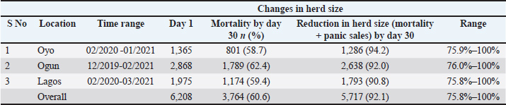 Table 6. Financial loss due to ASF outbreak in Oyo, Ogun, and Lagos states, Southwest Nigeria (December 2019–March 2021).