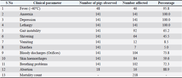 Clinical and epidemiological findingsClinical signs were consistently observed across the affected farms. Anorexia, depression, and lethargy were reported in 100% of cases, followed by fever in 95.8% of pigs. Other frequently noted signs included abortion in pregnant sows (88.9%), bloody discharges (73.8%), and gait instability (65.2%) (Table 8, Fig. 4). PCR targeting the VP72 gene of the ASF virus confirmed the presence of ASF on the affected farms.