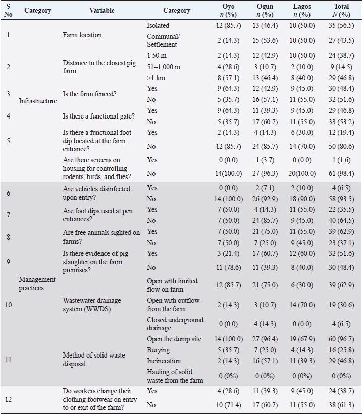 AbstractBackground: African swine fever (ASF), a highly contagious, hemorrhagic viral disease of pigs, continues to decimate the global pig population. Aim: This study was designed to investigate key field events, morbidity patterns, mortality rate, clinical findings in pigs, and biosecurity breaches on farms during the ASF outbreak in Southwest Nigeria (2019–2021). Methods: Farms (n=62) accommodating 6,208 pigs in Oyo, Ogun, and Lagos states were investigated. Information on the demographic characteristics of farmers, their knowledge of and experience with ASF, the sequence of morbidity onset across age groups, and the rate of farm size reduction was obtained using structured questionnaires. Clinical findings in diseased pigs and biosecurity breaches related to farm infrastructures and management practices were observed and assessed using a modified standard template. Data were analyzed using descriptive statistics and chi-square at p < 0.05. Results: Most of the farmers were between 40 and 60 years old and were predominantly men. A significant proportion had over 5 years of experience, and most had a pre-outbreak herd of 200 pigs or less. Many farmers had experienced previous ASF outbreaks leading to losses. Pig age was associated with the sequence of morbidity onset, with the most frequent sequence being adults → piglets → weaners → growers. Mortality, farm size reduction, and financial loss were 60.6%, 92.1%, and ₦166,264,000, respectively. Clinical findings were consistent with hemorrhagic fever in pigs. Biosecurity breaches include a lack of quarantine facilities, limited use of fencing, gating, foot dips, and netting, pig farm aggregation, continuous pig flow on farms, poor vehicle disinfection, uncertified replacement stock, open waste dumping, uncontrolled visitor access, and unrestricted pig movement. Conclusion: Biosecurity breaches across farm infrastructure, management practices, and human behavior aided the spread of ASF in Nigeria, leading to significant economic losses. Strengthening biosecurity, regulating pig movement and market activities, educating stakeholders, and ensuring government led surveillance and compensation are critical to controlling ASF and safeguarding Nigeria’s pig industry. Keywords: African swine fever, Mass mortality; Panic sales, Pig disease, Biosecurity breaches. IntroductionPig production continues to serve as a crucial source of animal protein and income generation for many sub-Saharan African countries (Janse van Rensburg et al., 2022), with Nigeria ranking among the continent’s foremost pig producers (Robinson et al., 2014, Adesehinwa et al., 2024). Between 1984 and 1997, Nigeria experienced rapid growth in its pig population, expanding from approximately 2 million to over 7 million pigs. However, this upward trend was disrupted by the first officially confirmed outbreak of African swine fever (ASF) in 1997 (Odemuyiwa et al., 2000; Fasina et al., 2010). Subsequent outbreaks caused extensive losses in pig populations with lasting social and economic consequences (Otesile et al., 2005; Babalobi et al., 2007; Igbokwe et al., 2018; Omotosho, 2020). The disease has since emerged as a major constraint to pig farming in Nigeria, significantly impeding industry growth and profitability (Ebwanga et al., 2021; Ogundijo et al., 2023). Recurring outbreaks have been documented in vital pig producing and marketing hubs, particularly in the southwestern, central, and eastern regions of the country (Fasina et al., 2010; Owolodun et al., 2010; Igbokwe et al., 2018). The disease also remains endemic across many sub-Saharan African nations, with recent incidents reported in West African countries, such as Togo, Benin, Senegal, Côte d Ivoire, The Gambia, Burkina Faso, Ghana, Guinea Bissau, Mali, Guinea, Sierra Leone, and Nigeria (Wadoum et al., 2020). ASF poses a significant threat to food security across the African continent and is associated with considerable economic damage (Fadiga et al., 2013; Gebreyohannes, 2015). The disease continues to expand its geographic reach, affecting pig populations in multiple regions globally, thereby endangering the sustainability of pig farming worldwide (Blome et al., 2020; De Lorenzi et al., 2020). This acute, hemorrhagic viral disease targets the Suidae family, impacting both domestic and wild pig populations. It was first identified in Kenya in 1909 following the introduction of European domestic pigs (Montgomery, 1921; Mulumba-Mfumu et al., 2019). Since then, the virus has spread extensively across domestic pig populations in sub–Saharan Africa and beyond (Sánchez-Cordón et al., 2018). ASF persisted in Africa until it was likely introduced from Angola to Portugal in 1957 (Boinas, 2011; Danzetta et al., 2020; Ito et al., 2023). The disease is caused by the African swine fever virus (ASFV), a large, enveloped double stranded DNA virus (Rock, 2021). ASFV belongs to the genus Asfivirus within the family Asfarviridae and is the only known DNA arbovirus. The soft tick Ornithodoros spp. serves as its natural reservoir and biological vector (Njau et al., 2021; Jori et al., 2023). Domestic pigs (Sus scrofa) are highly susceptible to ASFV infection; however, subclinical infections have been observed in certain African wild pig species, including bush pigs (Potamochoerus spp.), warthogs (Phacochoerus spp.), and giant forest hogs (Hylochoerus meinertzhageni), which act as natural reservoirs (Stahl et al., 2019; Fischer et al., 2020). Under field conditions, ASF has an incubation period ranging from 4 to 19 days (Mebus et al., 1983, USDA, 2023), and infected pigs begin shedding the virus before clinical signs appear. High viral titers are typically present in all bodily fluids, including saliva, nasal secretions, feces, urine, conjunctival discharge, genital secretions, and blood from wounds, making transmission highly efficient (Sánchez-Vizcaíno et al., 2019). Surviving pigs may become chronic carriers and shoul