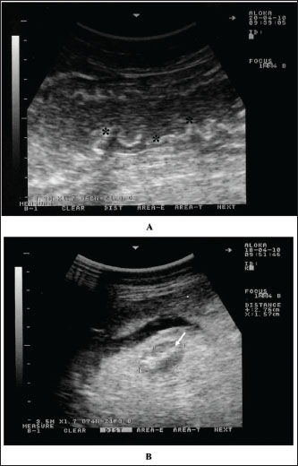 Fig. 2. Intestinal imaging in a dromedary camel with paratuberculosis. The intestinal walls were thickened and corrugated (stars) (A). Image B shows an enlarged mesenteric lymph node (white arrow) having an echogenic core. Scanning was performed at the right ventral abdomen using a 3.5 MH sector transducer.