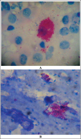 Fig. 4. Ziehl–Neelsen stain showing acid-fast bacilli obtained from a camel with paratuberculosis. Clusters of bacilli were identified from an enlarged and hemorrhagic lymph node at postmortem examination (A) while the bacilli were identified from feces antemortem from the same animal (B). Diagnostic proceduresCurrently, there are several techniques available for direct (i.e., PCR and bacterial culture) and indirect (i.e., interferon-γ and ELISA) detection of MAP infection. Bacterial culture is slow, expensive, and it takes up to 42 days or longer and is not available in all diagnostic laboratories (Prendergast et al., 2018). In the contrary, PCR is frequently used and more rapid to segregate high shedders from infected herds (Hereba et al., 2015). Additionally, PCR is used to immediately diagnose MAP from fecal samples with sensitivity ranges from 70% to 100% and specificity reaching 100% (Logar et al., 2012). Feces may also be tested by PCR for the verification of the IS900 gene and the identification of strains of MAP (Elsohaby et al., 2021). Real-time quantitative PCR is also currently used to confirm the diagnosis (Tigani-Asil et al., 2023). Herd screening is usually performed through complement fixation, agar gel immunodiffusion, ELISA, Ziehl–Neelsen staining of tissue or feces (Fig. 4), histologic pattern of a granulomatous reaction, DNA probes, and PCR techniques (Fig. 5) (Ellingson et al., 2004; Stott et al., 2005; Al-Swailem et al., 2011; Tharwat et al., 2012a,b; Al Naeem et al., 2024).