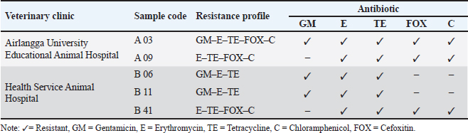 Fig. 3. Analyze the antibiotic sensitivity of a S. aureus isolate grown on MHA. The S. aureus isolate sensitivity results showed some resistance to the antibiotics erythromycin, tetracycline, cefoxitin, gentamicin, and chloramphenicol, each tested with variable degrees of resistance. The findings revealed that 29.69% (19/64) of the S. aureus isolates from cat nose swab samples at the Surabaya City Animal Hospital were resistant to antibiotics. These isolates included 11 from the Airlangga University Animal Hospital and 8 from the East Java Animal Husbandry Service Animal Hospital. These findings support the claims made by Qekwana et al. (2017) who isolated 63% (24/38) of S. aureus from cats at the Teaching Animal Hospital in South Africa has antibiotic resistance. Table 3. Profile of antibiotic resistance in isolated S. aureus.