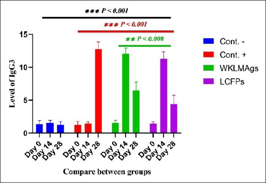 Fig. 7. The pre- and post-challenge statistically significant IgG3 between the groups showing significant change p < 0.008 and p < 0.001 at day 14 in pre-challenge groups of animals G3 and G4 separately, as well as after day 28 in the post-challenge groups G2–G4 with virulent LM correspondingly, compared with the control negative G1 at days 14 and 28, yet significant difference among G3 and G4 at 7 and 28 days. No alteration on day 0 among all groups (Cont. −=G1, Cont. −=G2, WKLMAgs=G3, and LCFPs=G4). Two-way ANOVA was used to evaluate significant changes in mean total cell (*p < 0.05, **p < 0.01, and ***p < 0.001; ns: not significant). Table 4. The Immunoglobulin G3 concentration (ug/ml) at days 0, 14, and 28 in immunized and challenged rats’ groups with virulent LM in serum.