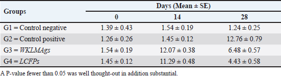 The positive control showed microgranuloma, encircled by typical hepatic cell cords, comprised of a buildup of monocytes with congestion (Fig. 10B) differs from (Fig. 10A) of Cont. −=G1 group. However, the hepatic section of WKLMAgs appears normal, with organized hepatocytes establishing radiating hepatic cords about the central vein and portal structures, but the hepatic tissues include a slightly dilated blood sinusoid. There were no inflammatory cells in the portal area or the parenchyma, but a proliferation of Kupffer cells (Fig. 10C). Furthermore, the liver shows a central vein at the center of the lobule. Hepatocytes radiate externally from the central vein, split by sinusoidal capillaries and maintained by reticular fibers, with the spread of Kupffer cells in the sinusoids in the LCFPs group of Figure 10D as in Figure 10A. Even though the monocytic cells infiltrated in the submucosa of the small intestine, leading to focal ulcerative enteritis ranging from mild to severe, accompanied by the shedding of mucosal cells into the intestinal lumen in (Fig. 11B) in the Cont. + group. While the lesion of the small intestine in the WKLMAgs group shows the absence of aggregations of lymphocyte cells within the lamina propria with an increased number of goblet cells, the planning of intestinal epithelial cells is disordered in Figure 11C comparable in Figure 11A. Furthermore, lesions of the group LCFPs appear significant in columnar surface epithelial cells of the small intestine that are systematized in centers to yield a form of villi, mucin-secreting goblet cells mixed in the epithelium with no aggregation lymphocyte cells in lamina propria (Fig. 11D) analogous in Figure 11A.