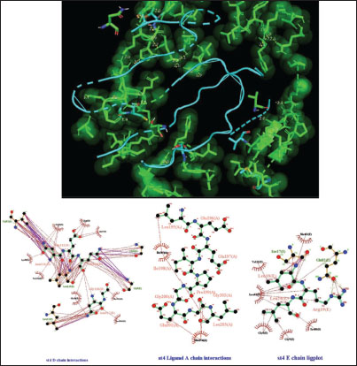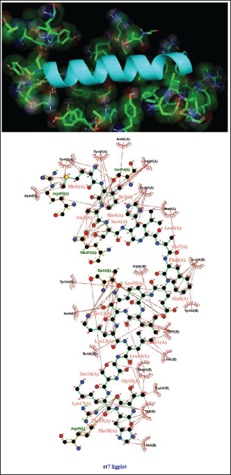 Fig. 2. Surface/glycoprotein of SARS-CoV-2 [PDB ID 7R40] with st2 (PDB ID 7X41) (scorpion toxin) Complex of SARS-CoV-2 surface-glycoprotein–st3 (scorpion toxin 3)The docking analysis of the SARS-CoV-2 surface glycoprotein with st3 (scorpion toxin 3) revealed significant binding affinities with cluster scores of −346.3 kcal/mol for Van der waals and electrostatic forces, −1420.8 kcal/mol for electrostatic favored interactions, −1497 kcal/mol for hydrophobic favored interactions, and −1189.6 kcal/mol for the balanced score. The interaction is stabilized by a hydrogen bond between LYS19 of chain A in st3 and THR21 of chain A in the SARS-CoV-2 surface glycoprotein, with a shortest bond distance of 2.508 Å, as shown in Fig. 3 and detailed in Table 1. Complex of SARS-CoV-2 surface-glycoprotein–st4 (scorpion toxin 4)The docking of the SARS-CoV-2 surface glycoprotein with st4 (scorpion toxin 4) demonstrated significant binding affinities, with cluster scores of −287.8 kcal/mol for Van der waals and electrostatic forces, −1334.8 for electrostatic favored interactions, −1430.7 for hydrophobic favored interactions, and −1259 for the balanced score. The interaction includes non-bonded contacts between ILE205 of chain A in st4 and LEU203 of chain A in the SARS-CoV-2 surface glycoprotein (shortest distance: 3.578 Å), and ILE121 of chain D in st4 and GLY118 of chain D in the SARS-CoV-2 surface glycoprotein (shortest distance: 3.800 Å). Additionally, hydrogen bonding was observed between ARG19 of chain E in st4 and GLN82 of chain E in the SARS-CoV-2 surface glycoprotein, with a shortest distance of 2.717 Å. (Refer to Fig. 4 and Table 1 for details).