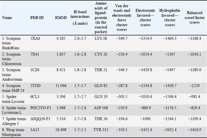 AbstractBackground: The SARS-CoV-2 virus is the infectious agent that causes coronavirus illness (COVID-19). The majority of virus-infected individuals will recover without the need for special care after experiencing mild-to-moderate respiratory symptoms. Some people, nevertheless, will get quite sick and need medical help. The choice of COVID-19 treatment should be made individually. The severity of the illness and the chance that it will worsen will determine the decision. Therefore, developing more potent medications is always a primary goal. Finding more effective drugs is a top priority. In this regard, natural animal toxins, such as toxin derived from scorpions, spiders, and wasps, have been found to include compounds that have significant therapeutic properties. Specifically, targeting the spike protein which acts as a gateway for the vires to enter the human or animal cells. Aim: This study focuses on the ability of toxins to destabilize the spike protein of the SARS-CoV-2 virus, which is responsible for the SARS-CoV-2 pandemic. Methods: The active protein structure of the SARS-CoV-2, the toxins chosen obtained from the RCSB-protein data bank (PDB), and the molecular structures of toxins that were not proteins were either obtained from PubChem or downloaded as computer structure models from RCSB-PDB. Using molecular docking software such as “PyRx,” analyzers such as “BIOVIA-Discovery studios” and “Pymol,” and various techniques, the evaluation of the interactions between the spike protein and toxin was performed, to find possible pharmacophores that might serve as a foundation for upcoming medication development. The protein-ligand complex was put to test through the molecular dynamic (MD) simulation via visual molecular dynamics /nanoscale molecular dynamics application to determine the complex stability. Results: The current research findings reveal intriguing binding affinities and interaction patterns between the toxin and the SARS-CoV-2 spike protein, where the complex was identified to be stable throughout the study resembling the cellular conditions via MD simulations. We discuss the implications of these interactions and how they might interfere viral infection and entry. Conclusion: The current study sheds light on a promising avenue for the development of antiviral therapies, leveraging natural venoms as a source of inspiration for pharmacophore-based drug discovery opposing viral infections. Keywords: SARS-CoV-2, Scorpions toxins, Spider toxins, Wasps toxins, Spike protein, Molecular docking, Pharmacophore. IntroductionBased on the SARS-CoV-2 pandemic and its fatal effects explored globally, various sets of research were planned and put into effect to identify the primary route and mechanism of viral infection. Similarly, the current research planned to focus primarily on the spike protein of the virion of the coronavirus, which is designated as the primary route of entry into the healthy human cells. However, the basic component of an infectious virus is made up of nucleic acid that is enveloped by an exterior protein shell known as virion. In 2003, as a result of the SARS-CoV outbreak in southern China and its broad incidence, more than 8,000 persons were affected, and 774 fatalities were recorded, according to the World Health Organization (WHO). A second outbreak of acute respiratory illness was detected in Saudi Arabia in 2012, and MERS-CoV was found to be the epidemic’s cause. The death rate was around 35%, according to the reports that were released (Mudenda et al., 2021a). Since then, several studies have been done targeting different kinds of the virus including the corona spike protein, which is the virus’ point of attachment to enter the host cells. On the other hand, it is also recognized that the toxins made by scorpions, spiders, wasps, bacteria, fungi, and plants specifically target particular cellular targets and disrupt regular cellular processes. The potential interactions between the corona spike protein and other toxins are examined in this research paper using molecular docking methods to understand the mode of action of these toxins and find possible therapeutic targets to fight not only SARS-CoV-2 but also other virus-mediated disorders (Mudenda et al., 2021b). The WHO classified SARS-CoV-2 to be a pandemic brought on by SARS-CoV-2 in March, 2020. The SARS-CoV-2 primarily affects the cells of the human respiratory system. However, recent research has shown that the virus affects the cells of the eyes, liver, kidney, pancreas, and brain. About 79% and 50% of the SARS-CoV-2 viruses are comparable to the SARS and MERS viruses. A global crisis has resulted from the widespread prevalence of SARS-CoV-2 due to the high transmission strength and complexity of SARS-CoV-2 therapy compared to MERS-CoV and SARS-CoV, and it is essential to stop the disease spread (Salahshoori et al., 2021). In this regard, the results of the current study emphasize the value of all encompassing strategy to fight infectious diseases, including the investigation of therapeutic alternatives to conventional antiviral medications. The novelty of the study includes determination of the anti-corona activity of natural toxins produced by the living organisms such as scorpion, spider, and wasp and evaluation of the entry inhibition for coronavirus into the healthy human cells through molecular dynamic (MD) simulations and molecular docking. Materials and MethodsTarget and ligand-protein selectionThe 3D confirmers of the coronavirus spike protein’s electron microscopy, NMR, and crystallographic coordinates, scorpion toxins (n=8), spider toxins (n=3), and wasp toxin (n=1) structures were provided from the protein data bank (PDB) with the following properties: coronavirus spike protein PDB IDs: 7R40 (resolution: 2.9 Å) (Du et al., 2022), scorpion toxin (st1): PDB ID: 5XA6 (Meng et al., 2020), scorpion toxin (st2): PDB ID: 7X41 (resolution: 1.15 Å) (Arzamasov et al., 