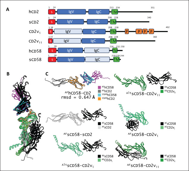 Fig. 1. CD58-CD2 models used in this study. (A) Annotation of CD2, CD58 proteins showing signal peptide (red), Ig domains (blue), transmembrane region (green), and proline-rich region (orange). (B) Superimposed models. (C) Models of CD58-CD2 complexes as generated in AF 3 (AFhCD58-CD2, AFsCD58-CD2, AFsCD58-CD2vi, AFsCD58-CD2vii) and based on refitting to the canonical CD58-CD2 complex (AltsCD58-CD2vi, AltsCD58-CD2vii). Concurrence between AF hCD58-CD2 model and experimental structure (PDB ID: 1QA9) is noted. Swine CD2-CD58 was also observed to stably interact within the time frame and similarly utilized equivalent residues Lys62, R67, and Tyr105 in binding to swine CD58. As expected, swine CD58 was observed to detach from the CD2vs early in the simulation (<2.0 ns). It has previously been noted that hCD2 binds to CD58 with low affinity (Binder et al., 2020). Using the simulation binding energy results from the corresponding MD simulations as a proxy for transient interactions, it may be that swine CD2 to CD58 binding is transient or slightly stronger than that observed in the human case. Furthermore, the observed results for CD2v binding in the canonical pose with swine CD58 further make it less likely to be correct as the calculated binding energies for these poses are almost negligible. To determine the likely CD58-CD2v interaction, an independent method was also used by adapting ensemble protein-protein docking (Othman et al., 2022) with three servers. The conformation ensemble for swine CD2, swine CD58, ASFV CD2vi, and ASFV CD2vii as generated through 300 ns all-atom MD simulations revealed 4, 1, 6, and 4 conformation(s) for the proteins respectively which were then used for docking. The top ten models from each server for each conformation combination were then compared to the respective AF models in HCA using pairwise RMSD as distances (Fig. S2).