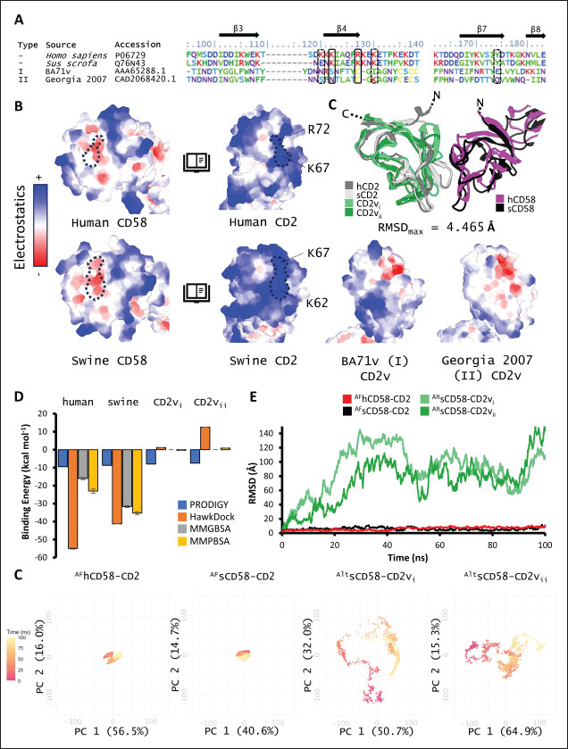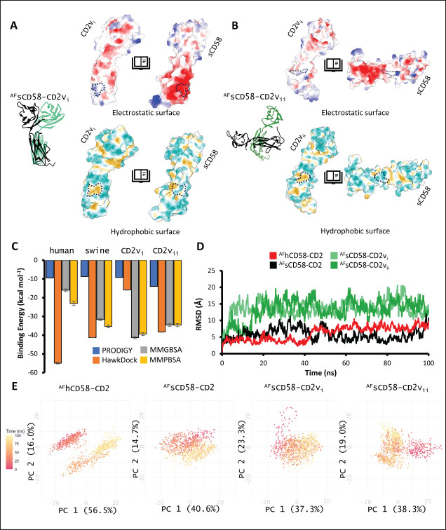 Fig. 3. Non-canonical binding of sCD58 with CD2vs. Surface maps (electrostatics, hydrophobicity) between sCD58 and (A) CD2vi or (B) CD2vii from AF models. Complementary sites marked. (C) Binding affinity of CD2v AF models compared to human and swine models. (D) RMSD profile of AF models. (E) Principal component plots of AF model trajectories.