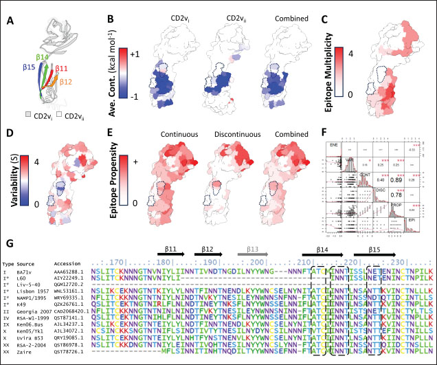 Fig. 4. Characterization of novel CD58 binding site of ASFV CD2v. (A) Structure of ASFV CD2v of genotype I (CD2vi) and II (CD2vii). The four β-strands contributing to the binding site colored accordingly. Visualization of (B) residue contribution to binding energy of CD2v with CD58, (C) epitope multiplicity, (D) residue variability, and (E) aggregate epitope propensity for both CD2vi and CD2vii based on continuous, discontinuous and combined predictions. (F) Correlation plot between average residue contribution to binding (ENE), residue variability (VAR), epitope propensity (CONT, DISC, PROP), & epitope multiplicity (EPI). (G) Alignment of ASFV CD2v sequences in binding site region. Most conserved residues in the site appear near β14 (dashed box). Metrics were primarily mapped onto CD2vi surface. Targeted conserved region marked in dotted lines. We further analyzed the conservation of the two immunogenic sites by comparing ASFV CD2v with other CD2 homologs (Fig. S5). First, results from structural clustering of CD2vs with mammalian CD2s and a CD2 homolog from Danio rerio (ZGC123293) show that ASFV CD2vs form a separate clade more distant than either the mammalian CD2s or zebrafish homolog. This reflects previous trends reported for cellularly-derived viral proteins exhibiting significant divergence from host sequences (Ravantti et al., 2020; Boys et al., 2023; Lomoio et al., 2023; Nomburg et al., 2024). An interesting result obtained from sequence clustering was the preservation of taxonomic relationships between mammals through CD2 homology. Specifically, ungulates, rodents, and primates clustered with each other. Nevertheless, broader relationships between these groups have not been recovered, with members from Euarchontoglires interspersed with those from Laurasiatheria (Upham et al., 2019). Taking this to mean that the structural clustering was more sensitive to closely allied species, it was surprising that (1) CD2vs from disparate genotypes were as diverse as those from different mammalian species, and that (2) several CD2vs from genotype I were clustered with more disparate strains than with each other. Notably, Lisbon 1957 clustered with genotype IX Ken06.Bus, NAMP1/1995 clustered with genotype II Georgia 2007 and genotype VII Malawi-Lil 20/1, and K49 clustered with genotypes IV (RSA-w1-1999) and X (Ken05/Tk1). As shown in Figure 8, the strains Lisbon 1957, NAMP1/1995, and K49 with Liv 5-40 and L60 also vary in sequence with the ASFV I representative CD2v sequence from BA71v. Of the 95 ASFV I CD2v sequences, 85 were identical to the BA71v sequence. In addition to the de novo emergence of new CD2v structures due to environmental pressures, recombination may be a means for how these ASFV I CD2vs have appeared, especially because they are more closely related to CD2vs from other genotypes than to each other. Of the two pandemic strains, ASFV I has been reported more frequently in sub-Saharan Africa, where most of the other genotypes have also been discovered (Njau et al., 2021). Nevertheless, even with co-infection by virtue of geographic proximity, viral recombination is more likely to occur when disparate strains are close to each other in terms of reproductive fitness (Chaikeeratisak et al., 2021). Table 1. Identified B-lymphocyte epitopes of CD2v from literature. Antigen preparation (Full protein or full, extracellular domain only or ER-only, intracellular domain only or IR-only, or as fusion to NoV capsid or NoV-fusion), source, paratope source, and mean epitope propensity indicated.