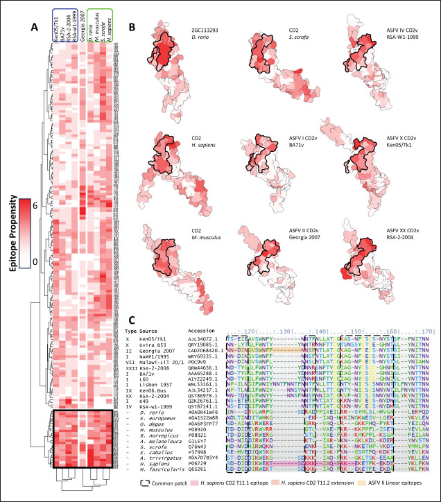 Fig. 5. Clustering of “core” residues across CD2 proteins and analogs using epitope propensity. (A) Hierarchical clustering of “core” CD2 proteins show conserved high propensity residues. (B) Location of high propensity residues mapped to CD2s and analogs. (C) Alignment of sequences from D. rerio ZGC113293, mammalian, and CD2vs show high propensity residues (marked by dashed lines) overlapping with known epitopes.