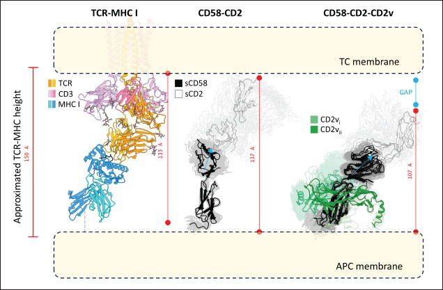 Fig. 6. Model of effect of CD2v binding to CD58 on host CD58-CD2 interactions. Shown side by side are TCR-MHC I complex (PDB ID: 8ES9), unconstrained CD58-CD2 complex, and constrained CD58-CD2 complex upon CD2v binding. Binding of CD2vs on proximal domain of CD58 forces an angle on swine CD58-CD2 pose that reduces the length of the complex, modifying the “ruler” functions of the proteins. Angle of face of CD58 also pivoted away from normal (blue arrows). The 150 Å estimate for the height of the IS core at leftmost. Spans of complexes labeled, plasma membranes for APC and TC in pale yellow. Additional components appear unlikely for CD2v-CD58 complexesPrevious studies have utilized a wide variety of metrics to evaluate AF complexes (Bryant et al., 2022; Gao et al., 2022; Yin et al., 2022; Xia et al., 2023; Zhu et al., 2023). These include metrics based on the global-topology sensitive TM-score such as pTM and ipTM, and DockQ-based metrics suggested to be more sensitive to the accuracy of predicted interfaces (Zhu et al., 2023). We note that a recent metric, the rank-score (or rank), has also been used previously (Elofsson et al., 2024). The thresholds generally set for complex predictions (pDockQ > 0.23, pTM >0.75, ipTM > 0.75) are often used as cut-offs for confidently predicted complexes. Nevertheless, these metrics have also been used in the relative ranking of complexes and for inference, the likelihood of complex components (Elofsson et al., 2024). Even if the human and swine CD2-CD58 metrics were found to be highly similar to the available PDB (RMSD1QA9: 0.647–0.785), the calculated metrics did not reach the thresholds for any of the three metrics mentioned above (pTM: 0.57, ipTM: 0.64–0.66, pDockQ: 0.0195–0.0201). This was observed for the other predicted binary complexes (pTM: 0.36–0.70, ipTM: 0.10–0.68, pDockQ: 0.02–0.032), and even in the multimeric complexes (pTM: 0.31–0.45, ipTM: 0.16–0.36). We nevertheless, utilized the scores as a relative measure to determine the most supported interactions and complexes. Initial pairwise complex predictions for the first complex set (C1): swine CD2, CD58, CD8, CD48, CD84, CSF2RA, and ASFV CD2v revealed that for all interactors except CD2v, CD2 was the more preferred binding partner compared to CD58 (Fig. S6b). Nevertheless, based on the interaction diagram according to rank score (≥0.385), CD2v appears to be more confidently connected to CSF2RA (0.410) than to CD58 (0.385) (Fig. S6a). The putative interaction network also suggests that among CD2-CD58 co-expressed proteins, none directly mediate CD2v-CD58 interaction, with most proteins more likely mediating CD2-CD2v interactions (Fig. S6c). Subsequent complex predictions reproduced the result with CD2 connected to CD84, close to a CSF2RA associated with CD2v. The CD58 protein also consistently contacted CD2 but modeled as if isolated in a separate cell membrane leaflet also leading to a reduced pDockQ for CD58 compared to the other proteins in the complex (Fig. S6c). This is similar to the case of CD9 in the predicted Izumo-Juno complex (Elofsson et al., 2024). Repeating complex prediction without CD2 and CD48 (C2), did not change the low pDockQ seen for CD58 (Fig. S6c), and indeed CD58 was still relatively isolated from the rest of the complex, but now mostly found to be modeled in the same leaflet and contacting CD2v directly, with CSF2RA on the opposite side from CD58 (Fig. S7d). This further reinforced the earlier finding that co-expressed proteins to CD2 and CD58, and even an interactor of CD2v do not appear to mediate CD2v-CD58 binding. An alternative set using only CD58 co-expressed proteins was also analyzed (C3), composed of CD58, CD2v, ART4, and ADGRE3. The pairwise interaction network similarly suggested that the other proteins do not mediate CD2v-CD58 interaction (Fig. S6d). Multimer prediction strongly modeled the new interactors bound to their respective main pair partners, ART4 with CD58 and ADGRE3 with CD2v, the latter consistent even across differing complex topologies. Furthermore, unlike in C2, CD2v-CD58 interactions in C3 appear to be mediated by the interacting partners, mostly through ADGRE3 (Fig. S7f–h). ADGRE3 was found to also be co-expressed with CD58 in horses in STRING-DB, qualifying as a more likely interactor based on conserved orthologous co-expression (Tirosh and Barkai, 2005). Based on complex predictions, higher-ranking interaction partners to one protein that do not necessarily contact the other associated protein can prevent the latter two’s contact, either by sequestering it to a more associated complex (CD2v-CSF2RA-CD2) or through its direct contact (CD2v-ADGRE3). Nevertheless, comparing the mean pDockQ for CD2v for all the complex set-ups clearly present the original CD2v-CD58 binary complex as superior to the alternative cases with additional binding partners (Fig. S6f). Current prediction metrics suggest a low chance for additional components in the CD2v-CD58 complex. Similarly, previous experimental results also make additional components hard to accommodate. Many IgSF or CD2-like proteins that would be co-expressed in myeloid or lymphoid tissues are specific even with low-affinity (i.e., CD28, CD84), with the potential exception of CD48 (Davis et al., 1998; Acuto and Michel, 2003; Evans et al., 2006; Hünig et al., 2015; Siokis et al., 2018; Cuenca et al., 2019). However, as seen in both the interaction network and predicted complexes these proteins did not seem to contact CD2v or CD58. Furthermore, recent co-immunoprecipitation and reverse co-immunoprecipitation of CD2v and CD58 in PK15 cells (Chaulagain et al., 2021) further reduce the diversity of plausible co-interactors. Based on transcriptomic data of this cell line (Yang et al., 2017; Jiang et al., 2019; Lv et al., 2022), of the described potential interactors, only CD48 is additionally expressed in such cells, which again does not seem to interact with CD2v and CD
