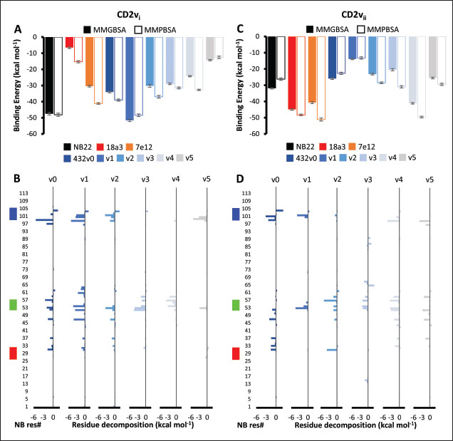 Fig. 7. Binding affinities from MD simulations of controls and optimization series. Shown are (A) binding of controls and optimization series to ASFV genotype I CD2 (CD2vi), (B) residue decomposition of optimization series in binding to CD2vi, (C) binding of controls and optimization series to ASFV genotype II CD2 (CD2vii), (D) residue decomposition of optimization series in binding to CD2vii. The trends observed for the optimization series seem to be captured in the residue decompositions of the nanobody series, particularly in the contribution of CDR2 to binding (Fig. 7b and d). This can be seen as a “spread” of residues in or near the CDR with significant binding energy. In cases where the nanobody has the lowest affinity to CD2v, the contribution from CDR2 also appears to be the lowest, and the same was seen when the affinity is highest; the contribution from CDR2 appears to be greater. Thus, for the optimized series, CDR2 appeared to be a key determinant of binding to ASFV CD2v. We also noticed that for all controls, there was more affine CD2v. These were CD2vii for the antibody fragments 7e12 and 18a3, and surprisingly, CD2vi for NB22. The difference in affinity of the controls to either CD2vi or CD2vii was found to range from 10.32 to 38.38 kcal mol−1, which was similar to what was observed for the nanobody series (8.12–37.76 kcal mol−1). While CDR2 being a key determinant for affinity to CD2vi or CD2vii in the optimized series might be expected given the optimization procedure, this is not necessarily the case for the controls that were developed only in the context of CD2vii (Jia et al., 2022; Zhu et al., 2024). Therefore, we explored the binding of the top NB in the series (v1 and v4) and controls (NB22 and 7e12), as shown in Fig. 8. Binding to CD2vi appears to require a broad interacting surface that cuts across the β-sheet. For NB22 and v1, this appeared to be achieved through a core (CDR3, CDR2) and accessory CDR (CD1, CDR3) for latching on the surface. Residues in these CDRs also seem to contribute to fewer nonpolar interactions. Meanwhile, in the case of binding to CD2vii, binding is mostly supported by targeting the aromatic residues present in strands β11–12. This is contrary to what was observed in CD58 binding, which emphasizes the role of short polar groups in interacting with Tyr residues. The 7e12 antibody and v4 seem to contribute to the swath of complementary aromatic residues through either a combination of or a single CDR. Therefore, optimization for both CD2vi and CD2vii may need to take these into consideration. While antibody fragments may be able to switch key interacting CDRs like in the case of 7e12 for this effect, with CDRs from the heavy fragment for CD2vi and CDRs from both fragments for CD2vii, this might be more difficult for NB. Nevertheless, using a long, flexible CDR as the core may be more useful as observed for NB22. NB and controls were then subjected to a longer coarse-grained simulation to determine whether the binding was stable for up to 3 µs (Fig. 9). Regression analysis of the complex RMSD of the all-atom and coarse-grained simulations in the first 100 ns suggests a correlation between the two ( p < 0.01, RCD2vi: 0.3119, RCD2vii: 0.2137), which may prove the utility of this approach. RMSDs of the NB generally appear to be bounded by the controls (18a3 and NB22) in the case of binding to CD2vi, while some controls (18a3) appear to be the maximal case in the case of binding to CD2vii. A general flattening behavior was also observed for most NB suggesting stability. Meanwhile, burSASA plots of the NB were generally seen to maintain or exceed the level observed in the first 100 ns throughout the rest of the 3 µs simulations. This implies that the levels of binding and affinity may have also been maintained throughout that time (Hollingsworth et al., 2016). Finally, comparing the physicochemical properties and reactogenicity of the NB to the controls suggests an overall better profile for the optimized NB (Table 2). In particular, v1 is predicted to be more soluble, more stable, has no allergenicity alerts, and has reduced antigenicity scores compared to the NB22 control (Zhu et al., 2024), which is more affine to CD2vi. Meanwhile, v4 is also likely to be more soluble and more stable, has reduced allergenicity alerts, and has lower antigenicity scores than the 18a3 control, which is more affine to CD2vii (Jia et al., 2022). The computed isoelectric points for the two NB were also above 9.4, which makes the NB potentially cell-penetrating (Li et al., 2012). This may further increase the scope of NB to target not only extracellular CD2v but also those distributed intracellularly, which has previously been shown to be a considerable fraction (Goatley and Dixon, 2011). Overall, our results point to a comparative advantage in the optimized NB v1 and v4 against controls NB22 and 18a3, respectively, towards their more affine CD2vs. DiscussionDeep-learning based protein modeling has revolutionized the study of protein dynamics and biomolecular interaction even leading to predictions of multimeric complexes that may be difficult to achieve through experimental methods (Bryant et al., 2022; Gao et al., 2022; Yin et al., 2022; Xia et al., 2023; Zhu et al., 2023; Elofsson et al., 2024). In this study, our initial results report an untenable “canonical” ASFV CD2v-swine CD58 interaction specifically due to the non-conservation of important residues (Wang et al., 2015), especially those that maintain proper charges at the interface, leading to the dismal binding seen even in short simulations. Indeed, a previous report on human CD58 binding to almost-identical primate CD2s showed cases of non-affinity, with only a few mutations in regions of the interface not previously implicated in binding (Damschroder et al., 2004). One mechanism to overcome the weak binding of viral proteins to host ligands has been observed in influenza, in which num