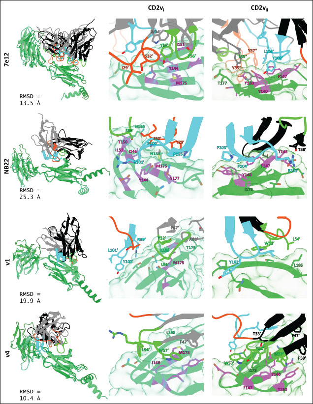 Fig. 8. Binding residues between selected controls and NB and ASFV genotype I or II CD2vs (CD2vi in spring green, CD2vii in forest green). RMSD between nanobody or antibody in CD2vi and CD2vii pose noted. Binding residues contributing at least −0.5 kcal mol−1 to binding affinity are shown, and those contributing at least −1.5 kcal mol−1 are labeled (nanobody or antibody residues with “or”). CD2v residues implicated in CD58 binding are in magenta. CDRs from 1, 2, 3 are colored orange-red, green, and cyan respectively. Other nanobody or antibody residues are colored in gray or black.