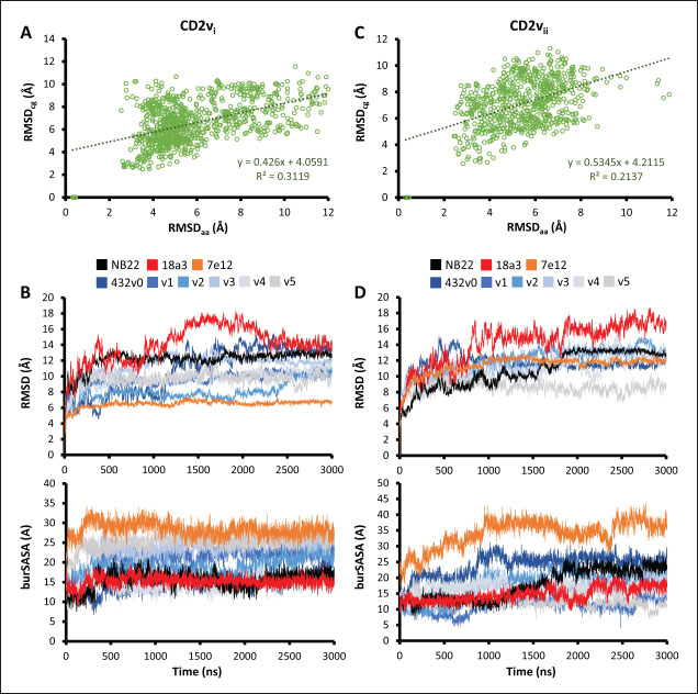 Fig. 9. MD simulations of controls and optimization series. Shown are results from regression analysis of RMSD between all-atom (aa) and coarse-grained (cg) simulations within first 100-ns showing some correlation for (A) CD2vi and (C) CD2vii binding. RMSD and buried SASA plots of NBs and controls in 3-µs MD simulations against (B) CD2vi and (D) CD2vii. Following this, using protein-protein docking and AF3 predictions we propose a non-canonical binding pose that utilizes the proximal domains of both CD2v and CD58. This binding pose was found to be stable and has a similar binding affinity to native swine CD2-CD58 (MMGBSA/MMPBSA: −41.32/−39.45, −34.63/−34.65, −31.65/−35.31 kcal mol−1 for CD2vi, CD2vii, and CD2 respectively). We also note that given the primacy of CD58 in CD2v-linked NFκB activation (Chaulagain et al., 2021), the recent study on NFκB-activity blocking epitopes for ASFV CD2v (Fan et al., 2024) seems to also support our finding. An epitope discovered (141LNINDTFVKYTNE153) overlaps the β-sheet of the CD2v proximal domain facing CD58 in the non-canonical binding pose. We also tracked potential pressures that have led to this novel binding site, such as potential immunogenic considerations that either function in protecting the CD58 interaction from the conserved epitope in the distal domain to potential masking functions, as seen in the SARS-CoV-2 spike proteins (Magazine et al., 2024). We further noted that even with the shift in site, CD2v binding to host CD58-CD2 interactions may still impact IS formation by reducing the span of the complex. As previously noted, CD58-CD2 complexes appear to mediate the inclusion of TCR-MHC I complexes to develop IS from the outer regions while restricting the entry of inhibitory phosphatases. Dubbed “kinetic segregation”, the process is thought to occur by the steric exclusion of proteins with larger extracellular domains such as those phosphatases (Binder et al., 2020). Segregation and exclusion of proteins by size at membrane interfaces is spontaneous, but the process is also affected by crowding, protein affinity, and membrane height fluctuations (Schmid et al., 2016). Following that principle, the reduced length of the CD58-CD2 “ruler” to about 100 Å might hinder the development of proper IS of about ~150 Å in width and consequently reduce lymphocyte activation (Dustin et al., 2010). Additionally, the angle introduced by CD2v binding on CD58 also reorients the CD58 canonical interface away from the normal of the cell surface. In the context of surface-surface interactions, a non-optimal orientation of a protein’s binding interface reduces its affinity to the cognate protein even if a low dissociation constant was monitored in solution binding studies (Evans et al., 2006). Through such a mechanism the novel binding pose stays consistent with previous reports of reduced lymphocyte activity associated to CD2v expression alone (Borca et al., 1998) even without directly interfering with CD2-CD58 binding. The novel binding interaction may also be informative on the recent within-cell CD2-CD58 interactions also found to be necessary for lymphocyte activation (Li et al., 2022). Table 2. Physicochemical and reactogenic profiles of NB in controls and optimization series.