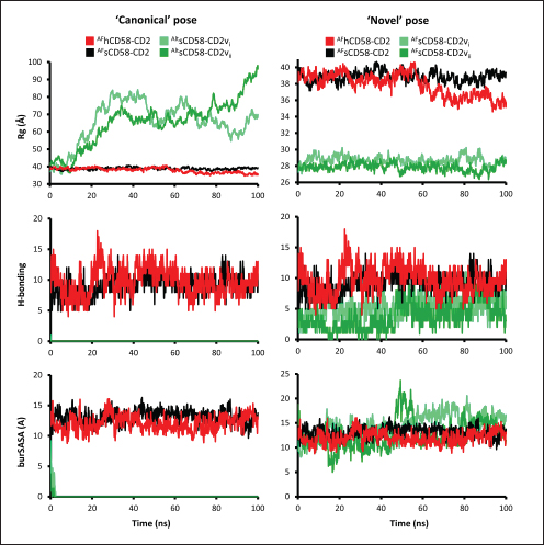 Fig. S1. Other measures from 100-ns simulations of CD58-CD2v in “canonical” and “novel” poses. Shown are Rg, Hydrogen-bonding (H-bonding), and burSASA profiles of the CD2 complexes compared to the control human and swine CD58-CD2 complexes in each case. Note diverging Rg profile, lack of H-bonding, and fast diminishing interface surface for canonical pose simulations of CD58-CD2v.