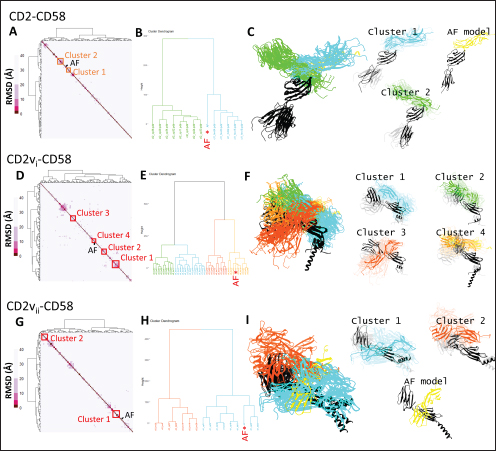 Fig. S2. Clustering of CD58-CD2, -CD2vi, or -CD2vii models. HCA of protein-protein docking derived and AF models for CD58 with (A) CD2, (D) CD2vi, and (G) CD2vii. Re-clustering of AF model with annotated clusters. AF model in red star for CD58 with (C) CD2, (E) CD2vi, and (H) CD2vii. Visualization of clusters with AF model in yellow for CD58 with (C) CD2, (F) CD2vi, (I) CD2vii.