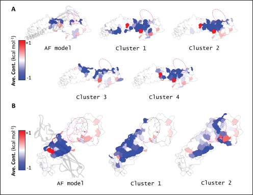 Fig. S3. Residue decomposition maps for CD2vs. (A) Residue decomposition map for CD2vi for the four clusters and AF model. (B) Residue decomposition map for CD2vii for the two clusters and AF model. Most contributing residues in blue.