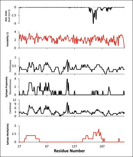 Fig. S4. Coincidence of average residue contribution to binding, residue variability, epitope propensity, & epitope multiplicity.