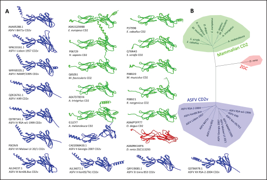 Fig. S5. Structural clustering of CD2 proteins and analogs. (A) Modeled CD2 proteins and analogs in AF3 for structural clustering in DALI server. ASFV CD2vs in blue, mammalian CD2s in green, D. rerio ZGC113293 in red. (B) Dendrogram showing clustering of CD2 proteins and analogs.