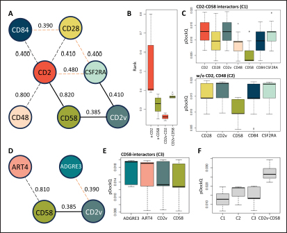 Fig. S6. Pairwise and multimeric complex analysis of CD58-CD2v system with potential interactors. Pairwise networks following the rank cut-off for (A) CD2 and CD58 co-expressed potential interactors, and (D) CD58-only co-expressed potential co-interactors. (B) Preference of interactors in “A” and CD2v towards CD2 (red) or CD58 (green) by rank. (C) pDockQ scores for components in full network in “A” or complex C1, and reduced network without CD2 and poorly connecting CD48 or complex C2. (E) pDockQ scores for components in network in “D” or complex C3. (F) Comparison of pDockQ of CD2v in complexes C1, C2, and C3 against the CD2v-CD58 binary complex.
