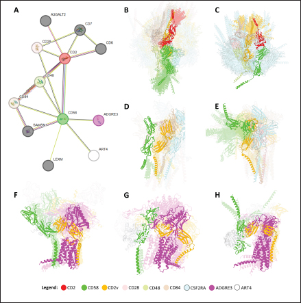 Fig. S7. STRING-DB result for CD2-CD58 and visualization of multimeric complexes. (A) STRING-DB network for swine CD2-CD58. (B) Multimeric complex of CD2 and CD58 co-expressed potential interactors (C1), and (C) emphasis on CD2v-CSF2RA interaction in multimer. (D, E) Potential states (joined, inverted) for multimeric complex of C1 proteins without CD2 and CD48 (C2). (F–H) Potential states (joined, opposed, inverted)) for multimeric complex of CD58-only co-expressed potential interactors (C3).