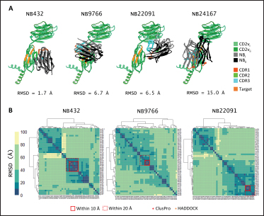 Fig. S8. Selection of top scaffold. (A) The four scaffolds with CDRs contacting the target conserved region and clashing with CD58. Components colored as above. (B) Validation of ClusPro docks to HADDOCK models, clustering within 10 and 20 Å highlighted with solid and dotted red lines respectively. ClusPro and HADDOCK poses in within 10 Å clusters marked with red and orange star.