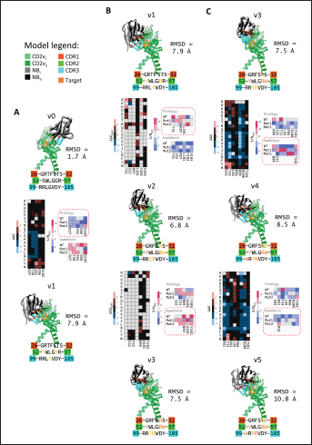 Fig. S9. Development of optimization series for NB432. (A) Original scaffold (v0) optimized to v1. (B) Alternative binding optimization from v1 to v3 followed by (C) simple binding optimization from v3 to v5. Shown are poses of the optimized NBi and NBii (dark gray, black) on CD2vi and CD2vii (spring green, forest green) respectively. CDR1, 2, & 3 in orange-red, green and cyan, and sequences shown with recent mutations in yellow, and previously mutated residues in orange. Heatmaps depict top two individual mutations tested (in star) for Taguchi experiments leading to final mutations introduced (in star).