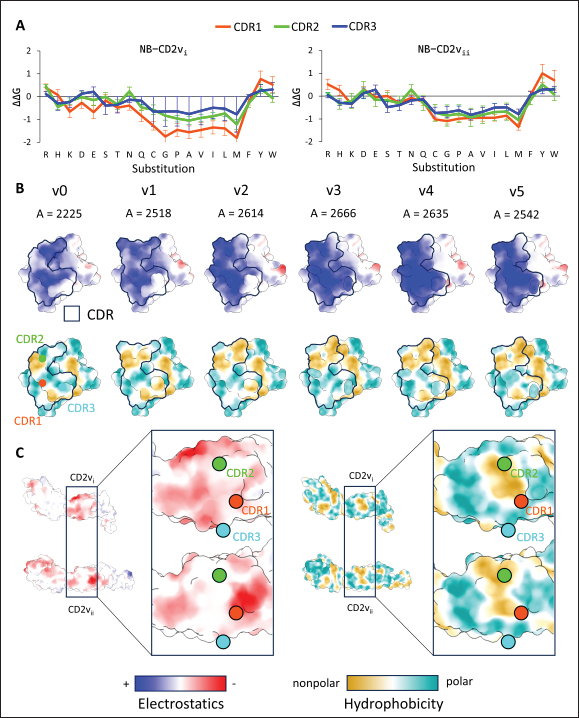 Fig. S10. Effects of mutations in optimization. (A) Preferability of residue mutation in CDRs. CDR1, CDR2, CDR3 colored in orange-red, green, and blue respectively. (B) Surface mapping of CDRs of source and optimized NB. CDR surface (border) colored according to electrostatics and hydrophobicity. CDR1, CDR2, CDR3 marked in colored circles (CDR1, CDR2, CDR3 colored in orange-red, green, and cyan). (C) Surface mapping of ASFV CD2v according to electrostatics and hydrophobicity, overlay of nanobody CDRs also marked in colored circles (see above).
