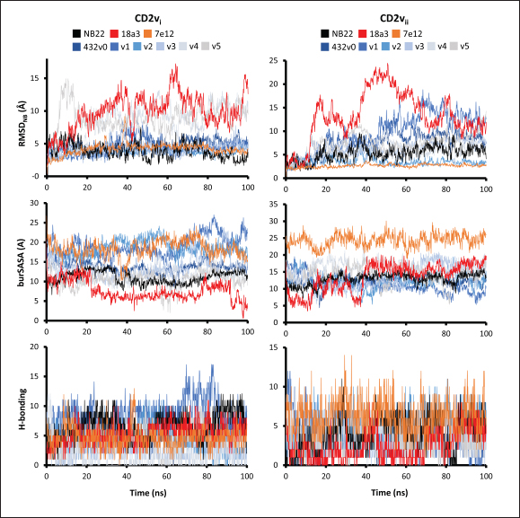 Fig. S11. Other measures from 100-ns simulations of NB and controls to CD2vi and CD2vii respectively. Shown are root-mean-squared distance centered on the nanobody (RMSDNB), burSASA, and Hydrogen-bonding (H-bonding) profiles. For CD2vi, most NB or antibodies, except 18a3 show some flattening in the RMSD profiles by the last 10 ns of the simulation. The same was observed for all complexes with CD2vii. 18a3 also appears to have reduced interface binding with CD2vi during the sudden RMSD jump near the end. | ||