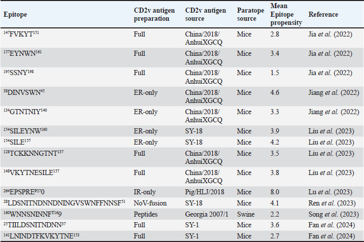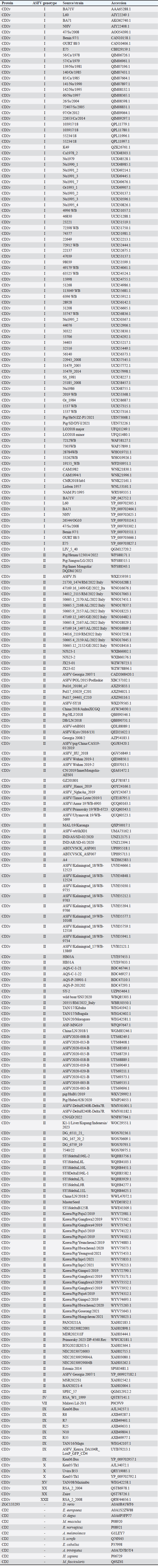 Correlation analysis for variability, epitope propensity, epitope multiplicity, and other data was performed using the Pearson correlation in the PerformanceAnalytics package in R. Clustering of epitope propensity across ZGC113293, selected mammalian and CD2vs was done through hierarchical clustering analysis (HCA) using correlation as distance metric implemented in the pheatmap package in R. Screening of nanobody scaffoldsNanobody sequences (30,667) were retrieved from the NanoLAS repository (https://www.nanolas.cloud/) (Xiong et al., 2024). Sequences were also processed in cd-hit to measure similarity to a nonredundant pool of 346 comparator NB with available PDB structures from the SAbDab-nano repository (https://opig.stats.ox.ac.uk/webapps/sabdab-sabpred/sabdab/nanobodies/) (Schneider et al., 2022). NB that clustered only with comparator NB bound to non-essential targets (e.g., plant and bacterial toxins, viral proteins) were then further filtered, as in previous studies (Panda et al., 2023; Poustforoosh et al., 2023) according to physicochemical parameters such as pI (>8), instability (<40) from ProtParam (https://web.expasy.org/protparam/) (Gasteiger et al., 2005), solubility (>0.45) from Protein-Sol (https://protein-sol.manchester.ac.uk/) (Hebditch et al., 2017), as well as reactogenic parameters such as toxicity (<0.6) from ToxinPred2 (https://webs.iiitd.edu.in/raghava/toxinpred2/batch.html) (Sharma et al., 2022), allergenicity (<0.3) from AlgPred2 (https://webs.iiitd.edu.in/raghava/algpred2/batch.html) (Sharma et al., 2021) and (Probably non-allergenic) from AllerTOP2 (https://www.ddg-pharmfac.net/AllerTOP/index.html) (Dimitrov et al., 2014), and antigenicity from VaxiJen v2.0 (https://www.ddg-pharmfac.net/vaxijen/VaxiJen/VaxiJen.html) (Doytchinova and Flower, 2007). Only the top 25 NB were considered as scaffolds for model generation and scaffold determination. Determination of top scaffoldModels for the 25 scaffolds were generated in SWISS-MODEL (https://swissmodel.expasy.org) (Waterhouse et al., 2018) using the template method, with the closest comparator nanobody to the scaffold as a template. Model metrics were analyzed using ERRAT (>91), PROCHECK (>95 Ramachandran-favored) (https://saves.mbi.ucla.edu/) (Colovos and Yeates, 1993; Laskowski et al., 1993), and ProSA-web (Pass) (https://prosa.services.came.sbg.ac.at/prosa.php/) (Wiederstein and Sippl, 2007). Models were either refined in GalaxyRefine (https://galaxy.seoklab.org/cgi-bin/submit.cgi?type=REFINE) (Heo, et al., 2013) or re-generated in AF 3 (https://golgi.sandbox.google.com/) (Abramson et al., 2024) when the calculated model quality metrics were sub-optimal. ASFV I and II CD2v models were generated as described above. The scaffold NBs were then checked for simultaneous docking to both CD2v models in the conserved region near the newly identified binding site (ATCXINNTX4NET). Docking was conducted in ClusPro (https://cluspro.org/home.php) (Kozakov et al., 2017) with the docking set to antibody mode, and the analysis was limited to the first ten clustered docks. Docking was also conducted in HADDOCK 2.4 (https://rascar.science.uu.nl/haddock2.4/) (Dominguez et al., 2003), with restraints set to the conserved region and the CDRs identified per scaffold. Scaffolds were primarily filtered by looking at the presence of contacts between the CDR residues and the conserved region and existing clashes of the nanobody to CD58 in UCSF Chimera (Pettersen et al., 2004). The binding affinities of the docks of these candidates to each CD2v were predicted using PRODIGY (https://rascar.science.uu.nl/prodigy/) (Xue et al., 2016). The top scaffold was selected by considering the binding affinity and propensity of epitope-contacting docks in ClusPro and the concurrence of ClusPro and HADDOCK dock poses for both CD2v. Optimization of top scaffoldOptimization involved the identification of mutable residues in nanobody-CD2v (NB-CD2v) docks using (1) DrugScorePPI (https://cpclab.uni-duesseldorf.de/dsppi/main.php) (Krüger and Gohlke, 2010) for in silico alanine screening, (2) HawkDock (http://cadd.zju.edu.cn/hawkdock/) (Weng et al., 2019) for residue decomposition, (3) PDBePISA (https://www.ebi.ac.uk/pdbe/pisa/) (Krissinel and Henrick, 2007), and (4) InterProSurf (https://curie.utmb.edu/pdbcomplex.html) (Negi et al., 2007) for contact and binding interface analysis. The most suitable mutation for a particular mutable residue was determined using in silico site-directed mutagenesis in mCSM-AB2 (https://biosig.lab.uq.edu.au/mcsm_ab2/) (Myung et al., 2020), measuring ΔΔG. Suitable mutations were validated through the generation of nanobody mutants, following the assignment of potential mutations according to the appropriate Taguchi orthogonal array (Poustforoosh et al., 2023). The mutants were generated in UCSF Chimera using the rotamer addition plug-in (Shapovalov and Dunbrack, 2011), followed by repair in FoldX (Delgado et al., 2019) before solvated minimization in Groningen Machine for Chemical Simulations (GROMACS) (Abraham et al., 2015) for 50,000 steps or until convergence of the maximum force below 10 kJ mol−1. The binding energy of each mutant was determined using PRODIGY and HawkDock. The signal-to-noise ratio for each mutation was then calculated (Freddi and Salmon, 2019) for the finalization of mutations to be included in the optimized nanobody. The optimization may either be simple or dock-biased. For simple optimization, analysis of mutable residues was limited to CDR residues to improve binding to the CD2v site, with the top two mutations in terms of conferred ΔΔG selected for each residue prior to validation. For dock-biased optimizations, residues were mainly limited to the CDR regions, but the minimization of alternative docking poses to CD2vs was also considered. Mutable residues in the alternative docking poses were also included in the analysis, and determination of suitable mutations also considered whether the mutat