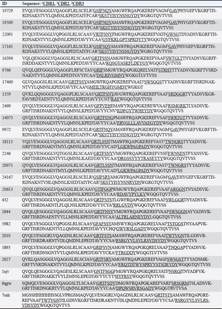 Table S2. Top 25 nanobody candidates as scaffolds with sequences with CDRs underlined.