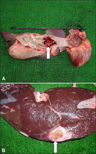 Fig. 5. Postmortem findings of cattle with caudal vena cava thrombosis. A: Friable thrombi tightly adhered to the wall of the caudal vena cava (white arrow). Thrombus almost entirely occluded the caudal vena cava and extended between the right atrium and the liver. B: hepatic abscessation (white arrow). Other tests, such as CBC and blood biochemistry analysis, may also lack the sensitivity to detect cardiac diseases (Bexiga et al., 2008). On the other hand, echocardiography provides a useful tool for observing the heart, and valves can be seen (Hallowell et al., 2007; Buczinski et al., 2010a,b,c). Without the use of echocardiography, a confirmatory diagnosis of mitral, tricuspid, or pulmonic vegetation. In most animals, the procedure permits an antemortem verification of BE that can be readily useful in those with a poor outcome to avoid ineffective therapy (Tharwat and Buczinski, 2011; Buczinski et al., 2012; Buczinski et al., 2013). Prognosis depends mainly on the chronicity of the disease, the early detection, and the value of the animal (Braun, 2009; Buczinski et al., 2010). Early detection by ultrasonography will therefore prevent more animal suffering and unnecessary costly medicines (Tharwat and Buczinski, 2011). Abomasal ulcerationUlceration of the abomasum is a general clinical problem in dairy cattle (Tharwat and Ahmed, 2012; Braun et al., 2020). Abomasal ulcers occur most commonly in dairy cows during the 1st 6 weeks of milking (Constable et al., 2017). Intensive management and high-acid diets predispose to the pathogenesis of this condition. Changing the diet from milk to roughage is also a predisposing factor for weaning calves (Blowey, 2004; Constable et al., 2005). Shunting a higher level of cardiac output to the gravid uterus or to the highly lactating udder with a concomitant decrease in abomasal perfusion and an increase in plasma cortisol may lead to abomasal ulceration (Constable et al., 1992). Prolonged usage of non-steroidal anti-inflammatory drugs (NSAIDs) as therapy for musculoskeletal disorders may lead to abomasal ulceration (Dirksen, 1994). Helicobacter pylori and hair balls are present in some cases of abomasal ulceration (Constable et al., 2017). In principle, the pathophysiological etiology is the alteration of the equilibrium between aggressive and protective mechanisms in the abomasal mucosa owing to stress. Clinical signs differ but are generally nonspecific. Hematology, fecal occult blood tests, and chemistry profile, as well as abdominocentesis, and sonographic examination, can assist in diagnosis. Ulceration can be treated medically, symptomatically, or surgically. Medical treatment approaches included blood transfusion, local coagulants, antibiotics, and oral or systemic anti-antacids (Ahmed et al., 2002, 2005). Stressful management practices, including commingling and transport, must be avoided (Hund et al., 2016; Hund and Wittek, 2017). Abomasal ulceration occurs commonly in cattle and can represent an additional therapeutic challenge when present with other surgically manageable conditions (Constable et al., 2017). Abomasal displacementDisplacement of the abomasum (DA) is a common abdominal disorder in dairy cattle and is the most common cause of abdominal surgery. DA may occur on the left side (LDA) or the right side (RDA). The peak occurrence of this disease occurs during the 1st 6 weeks of lactation, but it may also be found sporadically at any time of gestation or lactation (Constable et al., 2017). Several studies have investigated DA in cattle; however, a thorough elucidation of the pathogenesis has not yet been achieved. The exact etiology of DA is unclear. Numerous factors may predispose patients to DA. Excessive VFA formation is caused by intensive diets comprising highly acidic rations, such as corn silage, and readily fermentable grains, such as high-moisture corn. Other causes may include gut stasis due to infectious diseases or metabolic problems, such as ketosis, hypocalcemia, mastitis, metritis, retained placenta, and indigestion. Increased gas accumulation and altered abomasal motility are additional prerequisites for DA in cows (Zerbin et al., 2015). According to many studies, laboratory variables in conjunction with clinical signs offer the potential to objectively assess the prognosis of animals with DA (Sickinger, 2017). Milk feverMilk fever (MF), or parturient paresis (PP), is a complex metabolic disorder in dairy animals that occurs around parturition and is reported to be initiated by a calcium (Ca) metabolism imbalance. Hence, MF is usually observed immediately before, during, or after parturition, although it has also been reported in dry animals and during mid-lactation. Cattle with MF are at high risk of dystocia and metritis and are also much more susceptible to other infectious diseases and metabolic disorders, such as mastitis, displaced abomasum, ketosis, uterine prolapse, retained placenta, and high postpartum culling rates (DeGaris and Lean, 2008). Age increases the risk of MF by almost 9% per lactation (DeGaris and Lean, 2008). Heritability and repeatability for MF within this population are low, although significant (Saborío-Montero et al., 2018). At parturition, MF is manifested by hypocalcemia as a result of an abrupt increase in Ca requirement and delay in Ca metabolism adaptability. Both subclinical and clinical hypocalcemia act as transitional “gateway diseases,” as the presence of either form is associated with other transition disorders. The diseases associated with MF include uterine prolapse, dystocia, endometritis, retained placenta, mastitis, infertility, ketosis, DA, and immunosuppression (Goff, 2008). Cows with MF exhibit changes in metabolites related to carbohydrates and some innate immunity reactants several weeks before the appearance of MF. Tumor necrosis factor and serum amyloid A are the strongest differentials between MF and healthy cows, and they might be valuable predictors of MF (Zhang