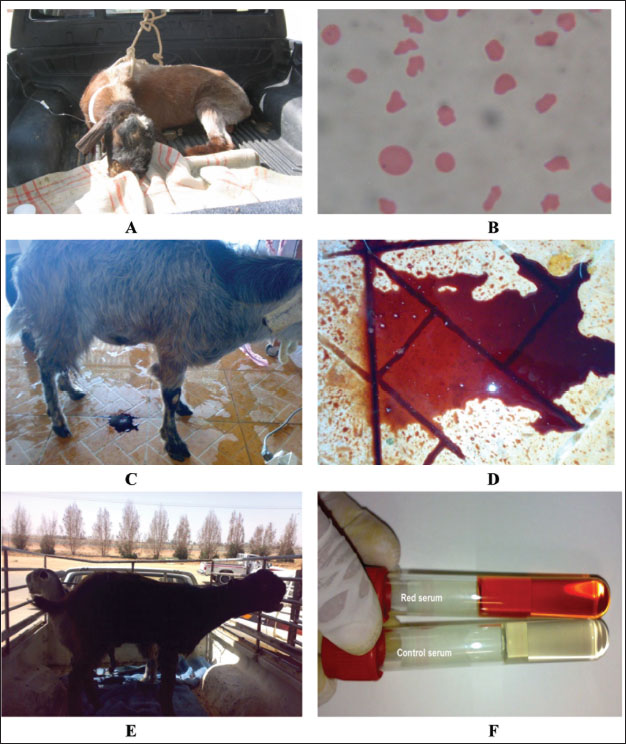 Fig. 12. Red urine of Syrian goats (A, C, and E). Figure B: Hemolytic RBCs. Image D clearly shows red urine and image F shows red serum in these cases. HypomagnesemiaHypomagnesemia or grass tetany (GT) is a nutritional and/or metabolic disorder of ruminant animals that is found in temperate regions with wet and cold climates, where grazed pastures are the principal source of diets for beef cattle (Tharwat, 1999). GT is linked to upgraded pastures and occurs when animals under intensive practices feed on fast-growing grass (Doncel et al., 2021). Despite the considerable advances in the prevention and pathogenesis of GT, several questions remain unanswered (Martens et al., 2018). The disease mainly affects lactating (lactation tetany) (Doncel et al., 2019) and pregnant dairy cattle fed lush, rapidly-growing grasses such as wheat, oat, or ryegrass. GT also affects pregnant and lactating beef cattle (Dutra, 2009, 2010). Weaned or suckling calves may rarely be influenced by a deficiency of dietary magnesium (Doncel et al., 2021).