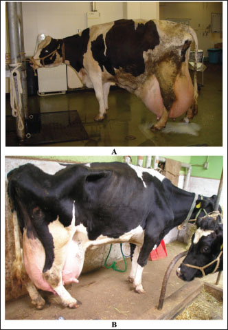 Fig. 14. Rupture of suspensory ligaments in two Holstein cows (A and B). Diagnosis of PT is based principally on history, clinical manifestations, and the appearance of ketones in the urine. In addition, various metabolic alterations develop following hyperketonemia and hypoglycemia. Important secondary differences include dehydration acidosis and renal insufficiency. Treatment is frequently unsuccessful, but repeated injection of small doses of glucose seems to be beneficial if other alterations, such as dehydration and acidosis, are controlled (Marteniuk, 1988; Tharwat et al., 2025). In healthy goats, the cardiac biomarker cTnI is not raised during pregnancy, but its concentration may be raised in a number of animals during vaginal or even cesarean delivery. On the other hand, the concentration of cTnI is sharply elevated in goats with PT; therefore, cTnI may be used as a prognostic marker in these cases. Only a slight elevation in the other cardiac biomarker, creatine kinase-myocardial band, was reported in goats with delayed birth is reported (Fig. 15) (Tharwat, et al., 2012e).