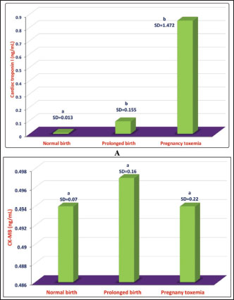 Fig. 15. Comparative mean ± standard deviation (SD) of cTnI in does with normal birth and prolonged birth and in those with PT. a,bdifferent letters indicate a significant difference (p < 0.05) (A). Image B shows comparative mean ± standard deviation (SD) values of CK-MB in does with normal birth, prolonged birth, and in those with PT. asame letter indicate a non-significant difference (p > 0.05). In conclusion, in farm animals, several PDs are encountered principally during TP, leading to decreased producer income, reduced consumer product quality, and impaired animal welfare. This review discusses several PDs that affect farm animals, including cattle, sheep camels, and goats. These diseases included FL, ketosis, sub-acute rumen acidosis, liver abscesses, CVCT, endocarditis, abomasal ulceration, abomasal displacement, milk fever, downer syndrome, postparturient hemoglobinuria, hypomagnesemia, mastitis, and PT. Because of the significant economic losses caused by PD, future directions should focus on the early detection and prevention of these diseases in farm animals. AcknowledgmentsNone. Conflict of interestThe authors declare no conflict of interest. FundingThis research received no specific grant. Author contributionMT: conceptualization, data collection, and writing of the original manuscript draft. AA: sharing in the writing and editing of manuscript drafts. SO: review and editing. All authors have approved the final manuscript for publication. Data availabilityAll data supporting the findings of this review are available in the manuscript, and no additional data sources are required. ReferencesAbdela, N. 2016. Sub-acute ruminal acidosis (SARA) and its consequence in dairy cattle: a review of past and recent research at global prospective. Achiev. Life Sci. 10, 187–196. Abril, G.A., Villa, G.T., Barros-Velázquez, J., Cañas, B., Sánchez-Pérez, A., Calo-Mata, P. and Carrera, M. 2020. Staphylococcus Aureus exotoxins and their detection in the dairy industry and mastitis. Toxins 12, 537. Ahmed, A.F., Constable, P.D. and Misk, N.A. 2002. Effect of an orally administered antacid agent containing aluminum hydroxide and magnesium hydroxide on abomasal luminal pH in clinically normal milk-fed calves. J. Am. Vet. Med. Assoc. 220, 74–79. Ahmed, A.F., Constable, P.D., and Misk, N.A. 2005. Effect of orally administered omeprazole on abomasal luminal pH in dairy calves fed milk replacer. J. Vet. Med. A Physiol. Pathol. Clin. Med. 52, 238–243. Alhafiz, G.A., Alghatam, F.H., Almohammed, H. and Hussen, J. 2022. Milk immune cell composition in dromedary camels with subclinical mastitis. Front. Vet. Sci. 9, 885523. Amachawadi, R.G. and Nagaraja, T.G. 2016. Liver abscesses in cattle: a review of incidence in Holsteins and of bacteriology and vaccine approaches to control in feedlot cattle. J. Anim. Sci. 94, 1620–1632. Amachawadi, R.G. and Nagaraja, T.G. 2022. Pathogenesis of liver abscesses in cattle. Vet. Clin. North Am. Food Anim. Pract. 38, 335–346. Bayer, A.S. and Scheld, W.M. 2000. Endocarditis and intravascular infections. In Mandell, Douglas and Bennett’s principles and practice of infectious diseases. 5th ed. Eds., Mandell, G.L., Bennett, J.E. and Dolin, R. Philadelphia, PA: Churchill Livingstone. pp: 857–902. Bexiga, R., Mateus, A., Philbey, A.W., Ellis, K., Barrett, D.C. and Mellor, D.J. 2008. Clinicopathological presentation of cardiac diseases in cattle and its impact on decision making. Vet. Rc. 162, 575–580. Blowey, R.W. 2004. Digestive disorders of calves. In Bovine medicine: diseases and husbandry of cattle. 2nd ed. Eds., Andrews, A.H., Blowey, R.W., Boyd, H. and Eddy, R.G. Hoboken, NJ: Blackwell Science, pp: 231–238. Bobe, G., Young, J.W. and Beitz, D.C. 2004. Invited review: pathology, etiology, prevention, and treatment of fatty liver in dairy cows. J. Dairy Sci. 87, 3105–3124. Braun, U. 2008. Clinical findings and diagnosis of thrombosis of the caudal vena cava in cattle. Vet. J. 175, 118–125. Braun, U. 2009. Traumatic pericarditis in cattle: clinical, radiographic and ultrasonographic findings. Vet. Rec. 182, 176–186 Braun, U., Fluckiger, M. and Pospischil, A. 2002. Diagnosis by ultrasonography of congestion of the caudal vena cava secondary to thrombosis in 12 cows. Vet. Rec. 150, 209–213. Braun, U., Nuss, K., Warislohner, S., Reif, C., Oschlies, C. and Gerspach, C. 2020. Diagnostic reliability of clinical signs in cows with traumatic reticuloperitonitis and abomasal ulcers. BMC Vet. Res. 16, 359. Brozos, C., Mavrogianni, VS. and Fthenakis, G.C. 2011. Treatment and control of peri-parturient metabolic diseases: pregnancy toxemia, hypocalcemia, hypomagnesemia. Vet. Clin. North Am. Food Anim. Pract. 27, 105–113. Buczinski, S., Francoz, D., Fecteau, G. and Difruscia, R. 2010a. A study of heart diseases without clinical signs of heart failure in 47 cattle. Can. Vet. J. 51, 1239–1246. Buczinski, S., Francoz, D., Fecteau, G. and Difruscia, R. 2010b. Heart disease in cattle with clinical signs of heart failure: 59 cases. Can. Vet. J. 51, 1123–1129. Buczinski, S, Rezakhani, A. and Boerboom, D. 2010c. Heart disease in cattle: diagnosis, therapeutic approaches and prognosis. Vet. J. 184, 258–263. Buczinski, S., Tolouei, M., Rezakhani, A. and Tharwat, M. 2013. Echocardiographic measurement of cardiac valvular thickness in healthy cows, cows with bacterial endocarditis, and cows with cardiorespiratory diseases. J. Vet. Cardiol. 15, 253–261. Buczinski, S., Tsuka, T. and Tharwat, M. 2012. The diagnostic criteria used in bovine bacterial endocarditis: a meta-analysis of 460 published cases from 1973 to 2011. Vet. J. 193, 349–357. Constable, P.D., Ahmed A.F. and Misk, N.A. 2005. Effect of suckling cow’s milk or milk replacer on abomasal luminal pH in dairy calves. J. Vet. Intern. Med., 19, 97–102. Constable, P.D., Hinchcliff, K.W., Done, S.H. and Gruenberg, W. 2017. Veterinary medicine: a textbook of the diseases of cattle, horses, sheep, pigs and