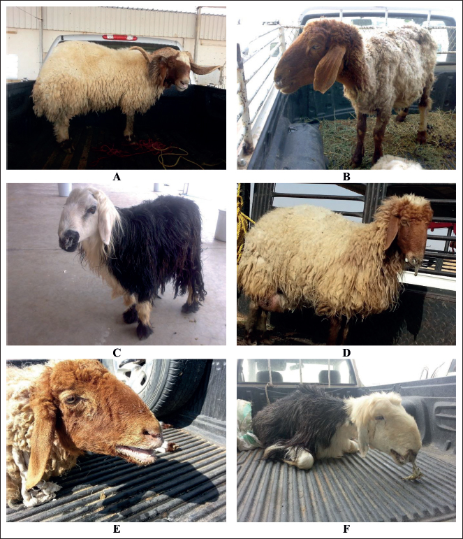 Fig. 1.Different clinical presentations in six sheep with contagious caprine pleuropneumonia. The ram in image A was admitted with a history of inappetence and polypnea. Image B shows a female sheep with a history of decreased weight gain and seromucoid nasal discharge. Images C and D show 2 females with mucoid and mucopurulent nasal discharge. Image E shows a female sheep with open-mouth breathing. Image F shows a female sheep with purulent nasal discharge and open-mouth breathing. In diseased sheep, ultrasonography of the lungs revealed a consolidated pulmonary parenchyma resembling hepatic texture; the lesions were visualized unilaterally in 28 cases and bilaterally in 6 cases. Pleural effusions were the outstanding sonographic findings in all diseased animals. The echogenicity of the pleural fluid ranged from anechoic to hyperechoic, with imaging showing precipitates in the pleural effusion. Fibrin networks were also visualized in 27 animals that were either mild or massive (Fig. 2). Dyspnea symptoms improved in sheep following pleural effusion aspiration. The volume of aspirated pleural fluid was 50–800 ml (Fig. 3). No other sonographic findings were detected in the abdominal cavity. In control sheep, no sonographic abnormalities were detected on thoracic or abdominal imaging.