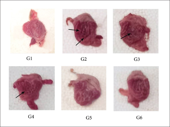 Fig. 1. Gastric mucosa lesion in rats; G1 served as control group; G2 served as ulcer control with indomethacin have sever injuries; G3, G4 and G5 received extract of Prosopis farcta at 300,400 and 500 mg/kg; G6 served as standard control with Ranitidine. The endogenous prostaglandins which regulate the mucosal blood flow, epithelial cell proliferation, epithelial restitution, mucus and bicarbonate secretion, basal acid secretion and mucosal immunocyte function. Indomethacin which prevents the prostaglandin synthesis due to decrements of prostaglandins and lead to ulceration (Khalaf et al., 2022). Hence, this study evaluated the antiulcerative activity of Prosopis farcta extract by measuring ulcer index, total acidity, free acidity and gastric juice volume in addition to examination of histopathological markers and macroscopic features. The repeated dose of oral for indomethacin that induced ulcer model exhibited a significant decrease in ulcer index (p < 0.05) in 5 days treatment with Prosopis farcta at doses 300 mg/kg, 400 mg/kg and 500 mg/kg respectively. Besides this, the ulcer healing percentage has significantly increased in a treatment doses which is dependent manner dose. On the other hand, ranitidine (20 mg/kg bw) exhibited a strong healing effect in indomethacin that induced gastric ulcer. The significant increase in the ulcer index detected in the ulcer group which received water after indomethacin instillation which confirmed the induction of ulcer. Supplementary, the extract revealed a protective action against indomethacin that induced injury of gastric mucosa as demonstrated by the inhibition or reduction of the gastric ulcer area. Moreover, it was revealed that P. farcta extract significantly decreased acid secretion. The treatment group with standard drug (Ranitidine) has significantly increased pH, and significantly reduced the free acidity and total acidity compared to the ulcer control group. As well, the activity of P. farcta extract is dependent on free acidity and gastric pH. Also, the total acidity by acid secretion that may be decreased. This effect was dose related due to administration of the three doses of plant extract. It means that local effect in gastric tissue of plant extract has an significant role in this regard. Resulting the parenteral administration of this extract had a significant effect only at dose (500 mg/kg), and has a lesser potency when compared to oral administration.