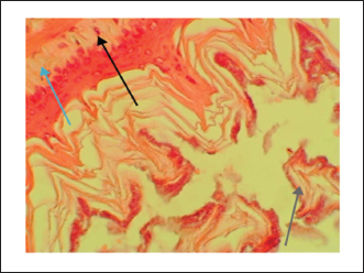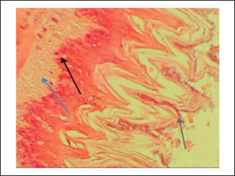Fig. 5. Prosopis farcta extract (300mg/kg) mild (↗) filtration of inflammatory cell, (↗) edema or less (↗) disruption in both the superficial and deep mucosal layers