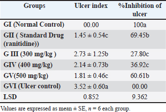 Fig. 7. Prosopis farcta extract (500 mg/kg) prevented histological changes, nofiltration of inflammatory cells, edema, or distruption of deepmucosa. The histopathological changes of gastric ulcer induction in the indomethacin (ulcer group) revealed the loss of epithelial layers, mucosal injury, decreased mucosal thickness with inflammatory cells infiltration and the distortion of mucosa and its glands. The ulcer initiation by indomethacin was accomplished on empty stomach via withholding food 12 hour before the induction later it has been revealed that the administration timing lead to gastric mucosal lesions which increased due to food that has buffering capacity against indomethacin effect. Also, the acute ulceration by lowering circulating prostaglandin levels and blocking COX (Jawad, 1976; Byeon et al., 2018). Prosopis farcta have been discovered the presence of resins, carbohydrates, alkaloids, flavonoids, phenols, tannins, saponins, coumarins, terpenes, and glycosides (Sharifi, 2019; Zughayyar and Gyad, 2023) In a previous study of Jain (2016), was reported that the secondary metabolites of plant specifically, terpenoids, flavonoids, and alkaloids have a major effect on treatment of peptic ulcer. On the other hand, the flavonoids are classified to be the most essential of secondary metabolites that have multiple mechanisms for working as an protection and antiulcer agent for gastric mucosa. These mechanisms includes: content increase of mucosal prostaglandin, free radical scavenging, cytoprotection and microcirculation improvement of gastric tissue (Mota et al., 2009; Serafim et al., 2020). Also, the flavonoids which preserves the effect of gastric cytoprotective through nitric oxide synthase and modulating prostaglandins (PG’s) pathways, which serves to mediates gastric blood flow, maintain stomach mucosal integrity, accelerates mucosal healing and inhibits gastric acid secretion (Zhang, 2019). The protective activities of all these saponins are probably due to activation of mucous membrane protective factors rather than due to inhibition of gastric acid secretion (Borrelli and Izzo, 2000). Furthermore, numerous plants that including high amount of saponins that acting as an activator factors of mucus membrane stabilizing due to retain antiulcer effects in several experimental studies (Morikawa et al., 2006). The study of Al-Rehaily et al. (2002) showed the presence of terpenoids, saponins, and tannins were found to possess properties of gastroprotective. Also, the tannins and terpenoids in sativa have the cytoprotective activity in the gastric mucosa. Furthermore, the terpenoids have several pharmacological properties, including antiulcer and anti-inflammatory effects (Arrietta et al., 2003). Tannins have antiulcer effect due to its vasoconstriction and astringency effects. These effects due to deposition of small-scale proteins on the ulcer site. Also the moderate layer was shaped and shields that averts gut and mucosa emissions with poisons and some other aggravations. The previous study, the above dynamic mixes has arranged and had ability to activate mucus, bicarbonate emission, prostaglandin and stimulate with the backsliding effect of responsive oxidants in gastrointestinal tract (Baker, 1994; Sakat and Juvekar, 2009; Abebaw et al., 2017). ConclusionThis study concluded that Prosopis farcta extract shows strong potential as a natural therapeutic option for the prevention and treatment of gastric ulcers. Additionally the presence of active photochemical in this plant lead to cytoprotective effects and regeneration of mucosal tissue. AcknowledgmentThe authors thank College of Veterinary Medicine for supporting. FundingThis research received no specific grant Author’s contributionsAH and OS: study’s concept. AH, OS, and RS: practical work, data analysis, tissue sections preparation and interpretation. AH and RS: writing and editing of the manuscript. All authors have revised the manuscript and prepared it for publication Conflict of interestThe authors declare no conflicts of interest. Data availabilityAll data supporting the current study are available in the manuscript. ReferencesAbebaw, M., Mishra, B. and Gelayee, D.A. 2017. Evaluation of antiulcer activity of the leaf extract of Osyris quadripartita Decne. (Santalaceae) in rats. J. Exp. Pharmacol. 9, 1–11; doi:10.2147/JEP. S125383 Allmjeed, D.I.A., Jumaa, R. S. and Ibrahim, O. M. 2024. Isolation and PCR-based detection of parvovirus in dogs. Open Vet. J. 14(12), 3213; doi: 10.5455/ OVJ.2024.v14.i12.6 Al-Rehaily, A.J., Al-Howiriny, T.A., Al-Sohalbani, M.O. and Rafaullah, S. 2002. Gastroprotective effects of ‘Amla’ Emblica offeinalis on in vivo test models in rats. Phytomedicine 9, 515–522; doi: 10.1078/09447110260573146 Anupama, S. and Handa, S.S. 1990. Hepatoprotective activity of andrographolide from Andrographis paniculata against CCl4. IJMR 92, 276. Available via https://PMID/2228074 Arrietta, J., Benitez, J., Flores, E., Castillo, C. and Navarette, A. 2003. Purification of gastroprotective triterpenoids from the stem bark of Amphipterigium adstringens, role of prostaglandins, sulfhydryls, nitric oxide and capsaicin-sensitive neurons. Planta Med. 69(10), 905–909; doi: 10.1055/s-2003-45098 Asadollahi, A., Sarir, H., Omidi, A. and Torbati, M.B. 2014. Hepatoprotective potential of prosopis farcta beans extracts against acetaminophen-induced hepatotoxicity. Available via https://pmc.ncbi.nlm. nih.gov/articles/PMC4223948/ Baker, M.E. 1994. Licorice and enzymes other than 11 betahydroxysteroid dehydrogenase: an evolutionary perspective. Steroids 59, 136–141; doi: 10.1016/0039-128x(94)90091-4 Bancroft, J.D. and Gamble, M. 2008. Theory and practice of histological techniques, 6th ed. Churchill Livingstone, Elsevier. Available via https://www. sciencedirect.com/book/9780443102790/theory-and-practice-of-histological-techniques Basile, A.C., Sertié, J.A., Panizza, S., Oshiro, T.T. and Azzolini, C.A. 1990. Pharma