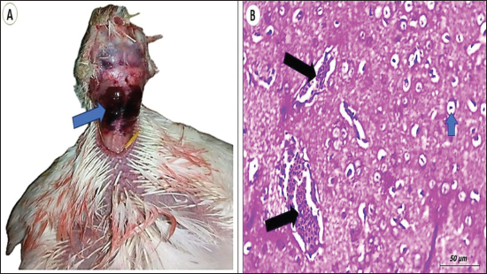 Fig. 3. Brain of examined morbid chicken (open system) A) severely hemorrhagic head and neck muscle (arrow). B) Brain sections showing congestion of most blood vessels (black arrow) with Wallerian degeneration of the brain tissue (blue arrow) (H&E stain, scale bar, 50 um). Pathological alterationsBroilers reared in a closed system did not exhibit pathological changes. Several pathological alterations were noticed with the examination of the dead chickens exposed to heat stress in an open system. Grossly, the muscles of the head and neck showed severe hemorrhage (Fig. 3A). In addition, the pectoral muscle showed dark congested areas with pale white color in other parts (Fig. 4A). Microscopical examination of most organs showed pathological changes that varied from degenerative changes such as vacuolar degeneration and fatty changes or extended to necrosis and fibrosis.