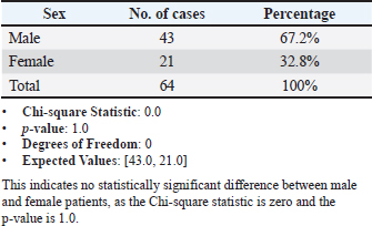 Figure 4 shows two Petri dishes with dermatophyte colonies cultivated on DTM. LPCB and sticky tape were used to identify the isolates. Figure 5 shows Microsporum canis produces spindle-shaped macroconidia with thick walls and a knob at the terminal end based on the morphological description of the macroconidia shape mentioned. The results of the current study showed that the total infection rate of cat dermatophytosis was 47% (64 out of 136): the seasonal prevalence was found to be 39% in winter, while it was lower in autumn, with an infection prevalence of 12.5%. These are statistically non-significant results at p < 0.05, as shown in Table 1. The dermatophyte infection rate according to breed distribution in this study revealed the highest infection rate in crossbreeding (42.2%), while the lowest infection rate was in the local breed (3.1%) (Table 2). The prevalence of dermatophytes according to the sex of the animal showed a higher percentage in males (67.2%) than in females (32.8%) (Table 3). Depending on the age group of animals included in this study, the results illustrated that cats younger than 1 year had a higher infection rate (84.4%), whereas cats older than 1 year had a lower incidence rate (15.6%) (Table 4). Table 3. Distribution of positive dermatophyte cases according to sex.