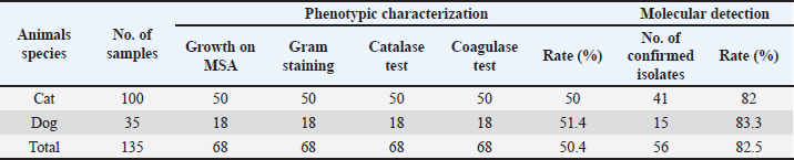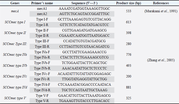Staphylococcal cassette chromosome mec gene typing in MRSA isolates from healthy pet animals Multiplex PCR was used to amplify the SCCmec genes according to the method performed by (Zhang et al., 2005). A PCR mixture volume of 30 µl was used, and the details of the SCCmec primers (I, II, III, IVa, IVb, IVc, IVd, and V) are shown in (Table 1). Characterization of the virulence genes of MRSA isolates from pet animals Different virulence genes were selected to examine whether they were found in MRSA isolates or not. The following virulence genes were selected: Panton-valentine leukocidin (PVL), Arginine Catabolic Mobile Element (arcA), LukE-LukD leucocidin (lukE-lukD) gene, Alpha-hemolysin (hla), Beta-hemolysin (hlb), toxic shock syndrome toxin-1 (tst), accessory gene regulator (agr) genes, and exfoliative toxin A (eta) and exfoliative toxin B (etb) genes. A total volume of 20 µl PCR mixture was used, and each gene was amplified according to details described in Table 2. Antimicrobial susceptibility of MRSA isolates The confirmed MRSA isolates by PCR were selected to examine the susceptibly patterns of the 14 antimicrobial agents from different antimicrobial classes using the automated Vitek 2 Compact System. The isolates were categorized as susceptible, resistant, or intermediate according to the guidelines provided. ResultsNasal carriage of S. aureus in healthy pet animalsA total of 135 nasal swabs were collected from apparently healthy household pets, including 100 cats and 35 dogs. Samples were then subjected to phenotypic and molecular characterization. Furthermore, the isolates were screened to obtain an antibiotic resistance profile, and the samples were further processed for the phenotypic detection of MRSA phenotypically and also through the amplification of mecA gene among healthy animals. Of the 135 nasal swabs from both cats and dogs, 68 (50.4%) were tested positive by using standard bacteriological methods. Therefore, the rate was different among the 100 cats: 50 (50%) were positive and among the 35 cats, 18 (51.4%) were suspected. The amplification of the S. aureus species-specific nuc gene (226 bp) showed that of the 68 suspected isolates, 56 (82.4%) samples were confirmed as S. aureus. However, the recovery rate was different; S. aureus was detected in 41 of 50 cats and 15 of 18 dogs at rates of 82% and 83.3%, respectively (Table 3). Nasal carriage of MRSA in healthy petsThe nostrils of healthy pets were also examined to determine whether they carried MRSA isolates or not; the detection was performed through the amplification of mecA gene and phenotypically by antibiotic susceptibility test. The results showed the detection of MRSA in nostril isolates at a total rate of 23.2% (13/56) from both cats and dogs. The prevalence rate was different in cats and dogs and it was 22% (9/41) and 27% (4/15), respectively. Table 2. Details of primers that were used to examine different virulence genes among MRSA isolates.
